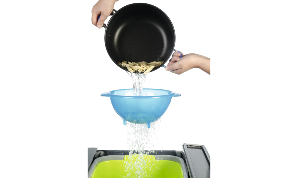 10-teiliges Set - bestehend aus 1 Topf ø 24 cm - 6 l, 1 Sieb ø 22 cm, 1 Pfanne ø 24 cm - 2,5 l, 1 Topf ø 20 cm - 2,5 l, 1 Topf ø 16 cm - 1,5 l, 1 Pfanne ø 20 cm - 1,5 l, 1 Deckel ø 24 cm, 1 Deckel ø 20 cm, 1 Griffzange und 1 Gurt.