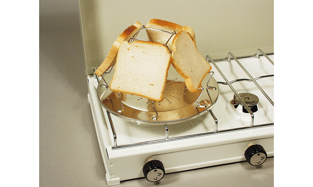 Camping-Toaster. Zusammenstecken und auf Flamme eines Gaskochers oder Grills stellen. Gleichzeitig können vier Scheiben Weißbrot toasten. Sehr platzsparend.