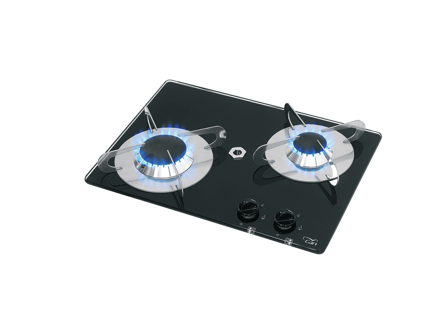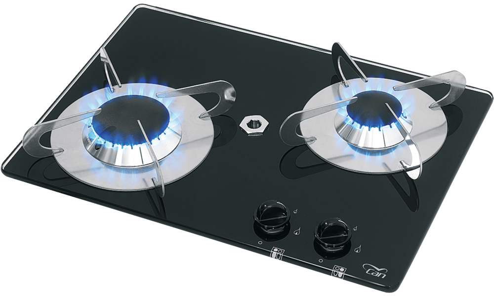 Kocher PV1351. 2-flammiger Einbaukocher mit temperaturbeständigem Sicherheitsglas 8 mm und Zündsicherung. Leistung 2,9 kW (1 x 1 kW, 1 x 1,9 kW). Gasverbrauch 200 g/h (1 x 73 g/h, 1 x 127 g/h). Gasanschluss 30 mbar.