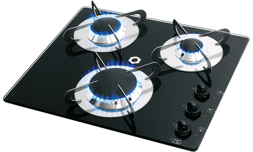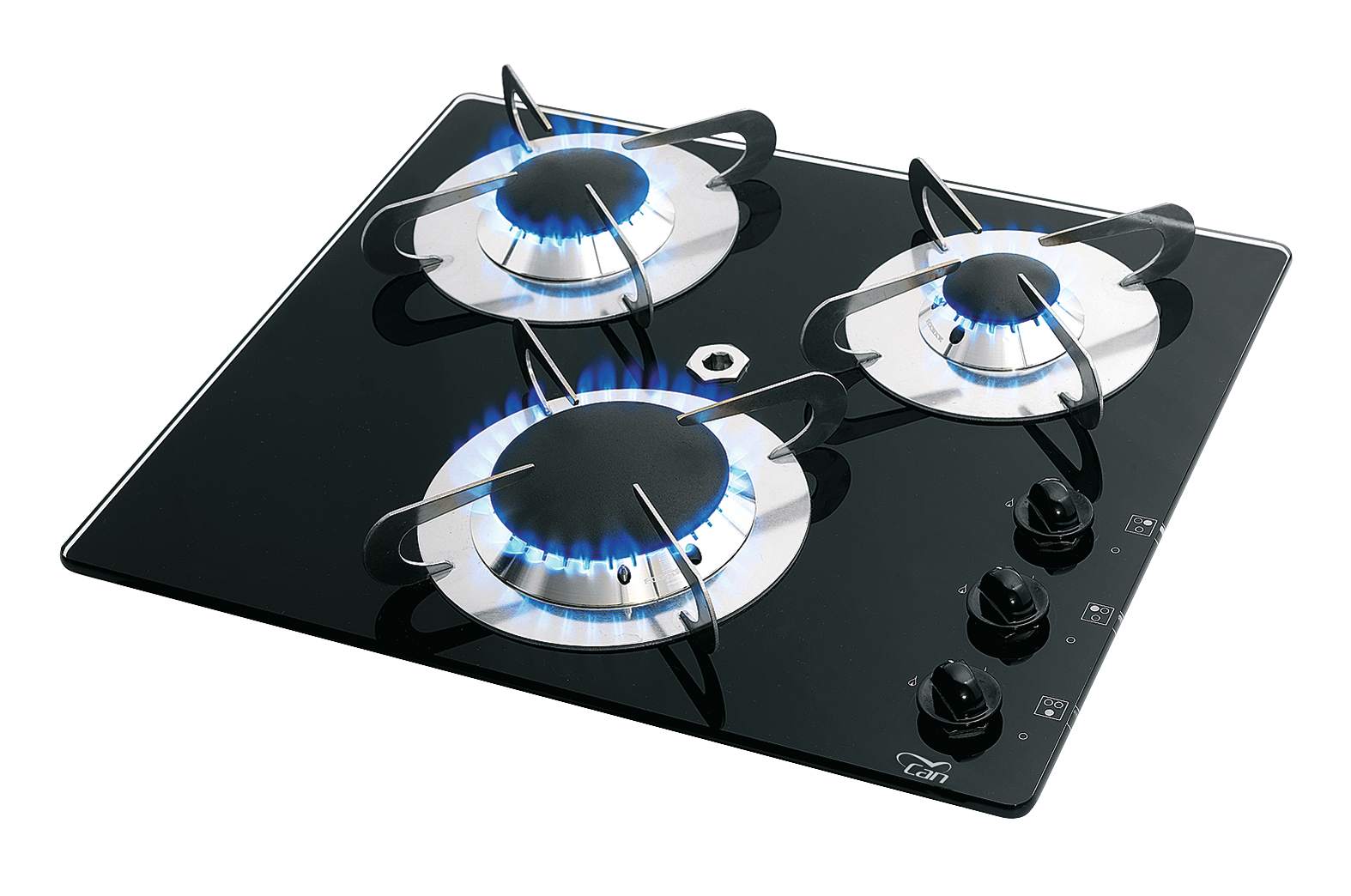 Kocher PV1352. 3-flammiger Einbaukocher mit temperaturbeständigem Sicherheitsglas 8 mm und Zündsicherung. Leistung 5,9 kW (1 x 1 kW, 1 x 1,9 kW und 1 x 3 kW). Gasverbrauch 418 g/h (1 x 73 g/h, 1 x 127 g/h und 1 x 218 g/h). Gasanschluss 30 mbar.