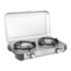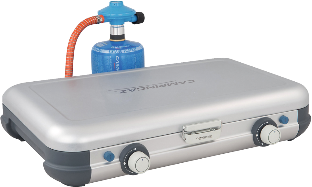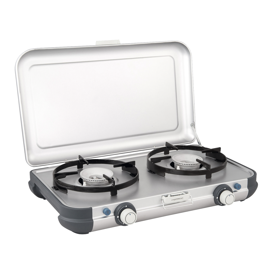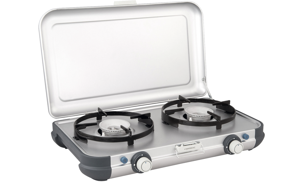 Das kompakte Design mt eingebauten Tragegriffen ermöglicht ein platzsparendes Verstauen im Auto oder dem Wohnmobil. Weiterhin hat der Kocher hitzeresistente Topfhalter aus emaillierten Stahl, die zusätzlich als Windschutz dienen. Die einfache Abnahme der Topfhalter ermöglicht ein schnelles und einfaches Säubern. Robuster Deckel aus lackiertem Stahl. Leistung 2 x 2.000 W. Gasverbauch 291 g/h.
