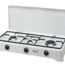 Luxus-Email-Gaskocher 3-flammig. Mit Zündsicherung. Leistung 4,85 kW (1 Hilfsbrenner 0,9 kW, 1 Normalbrenner 1,65 kW und ein Starkbrenner 2,3 kW). Gasverbauch max. 392 g/h. Farbe Weiß.