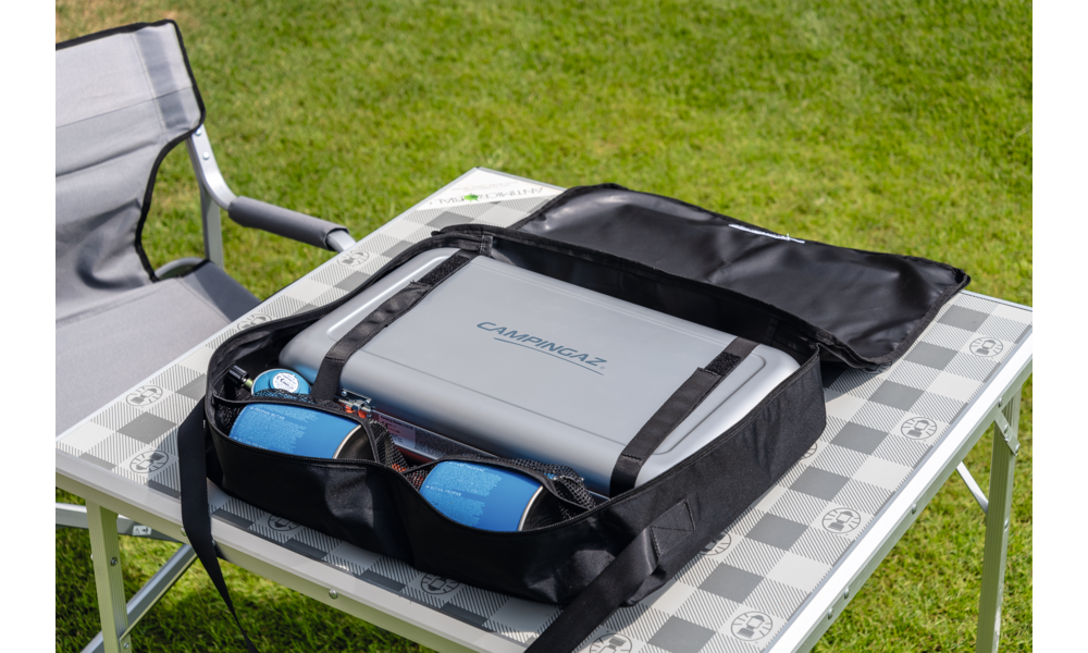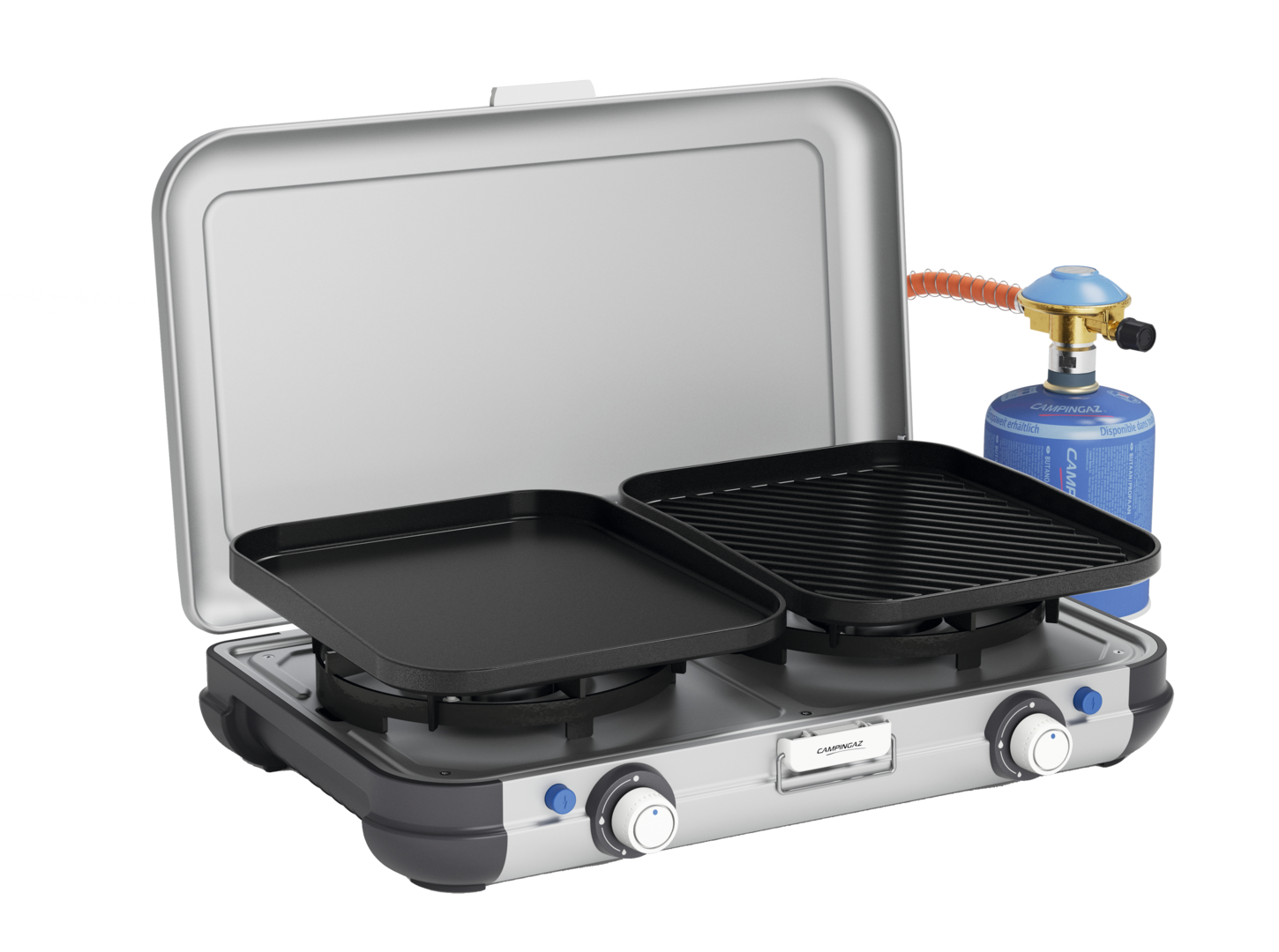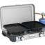 Camping Kitchen™ Grill & Go CV. Edelstahl-Kochfeld, Deckel aus lackiertem Stahl, Knöpfe aus Kunststoff. Plancha und Grillplatte aus emailliertem Stahl mit Antihaftbeschichtung. Beide Brenner mit Piezo-Zündung. Betrieb mit Gaskartusche CV. Leistung 2 x 4.000 W. Gasverbauch 291 g/h. Abmessungen offen 49 x 45 x 33 cm, geschlossen 49 x 35 x 10 cm.