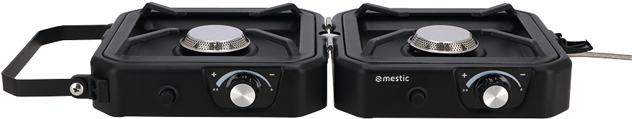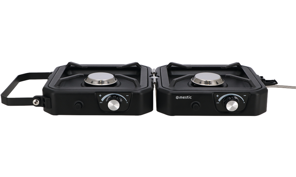 Tragbarer 2-flammiger Kocher. Kompakt und faltbar für einfache Lagerung.