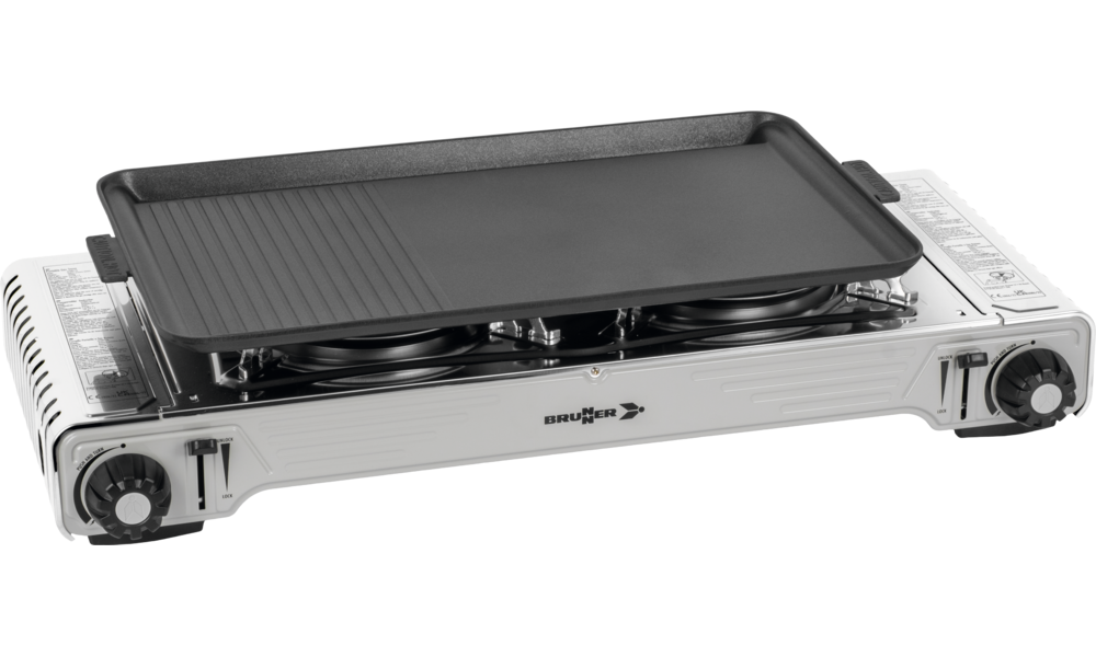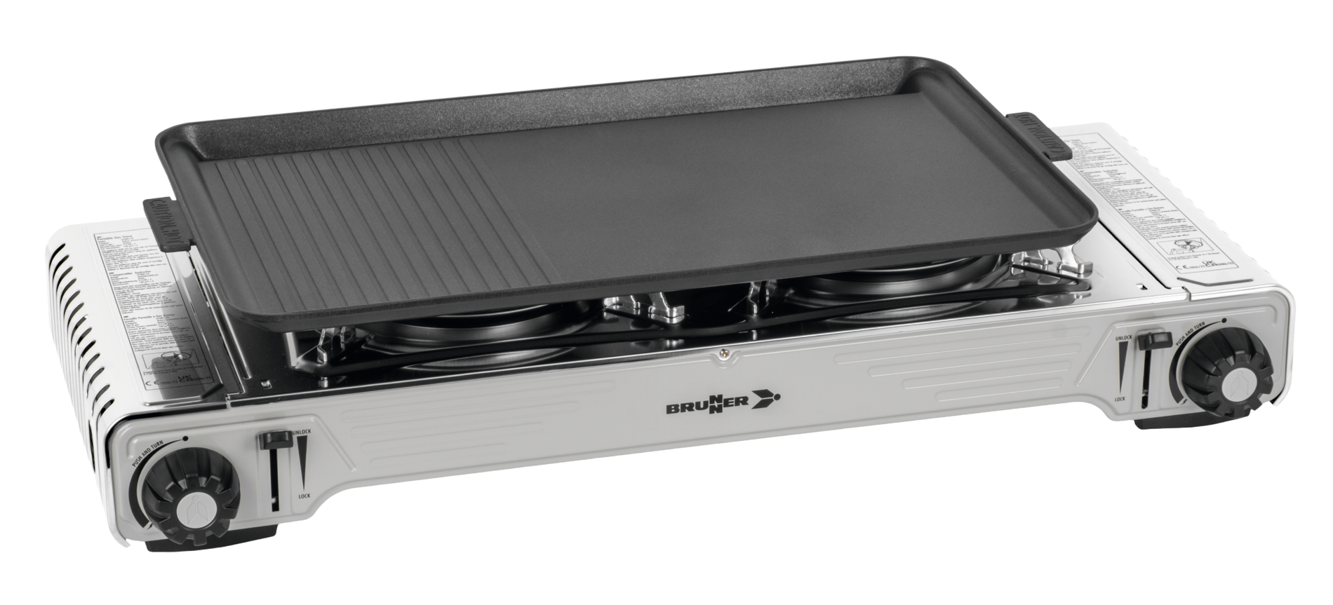 Kartuschenkocher DEVIL DOUBLE GRILL. Zweiflammiger Gaskocher mit Aluguss-Grillplatte, integrierter Piezozündung und zwei Aluminium-Brennern. Gaszufuhr regelbar. Ohne Zündsicherung.