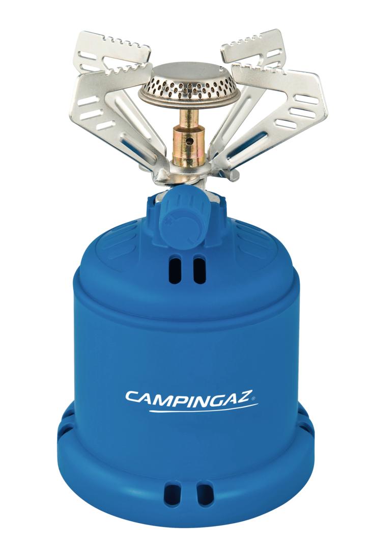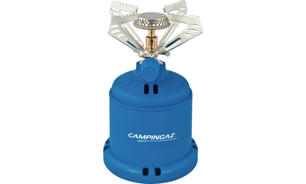 Kocher Camping 206 S. Robuster Camping- kocher mit Kunststoffglocke. Die vier Topfträger haben einen integrierten Windschutz. Leistung 1.230 W. Verbrauch 90 g/h. Brenndauer 2 h (C206 GLS).