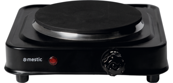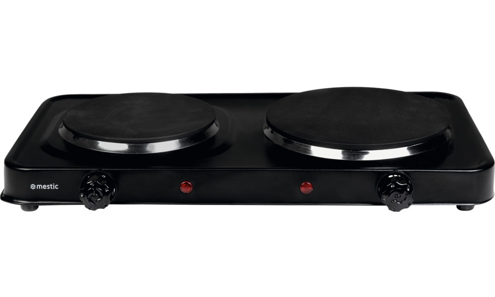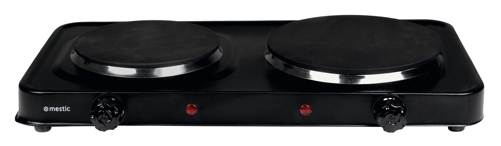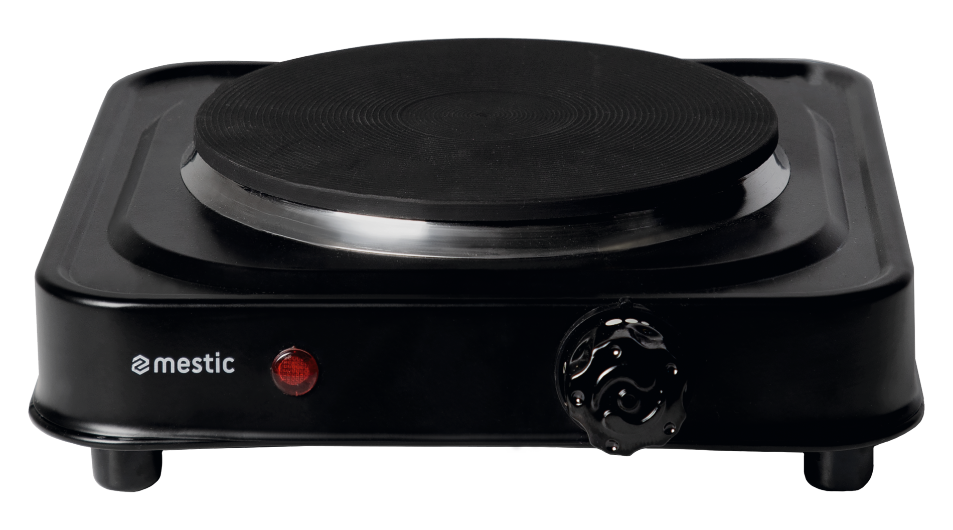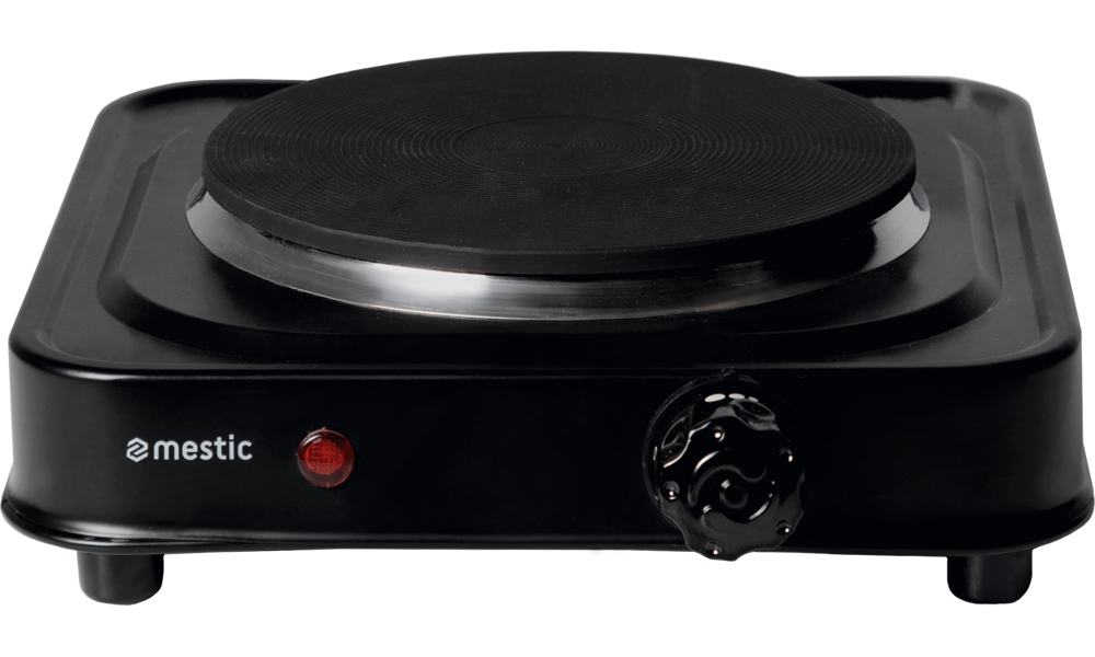 Elektrische Kochplatten mit einstellbarem Thermostat, hitzbeständigem Gehäuse, Überhitzungsschutz, roter Kontrollleuchte und Anti-Rutsch-Füßen.