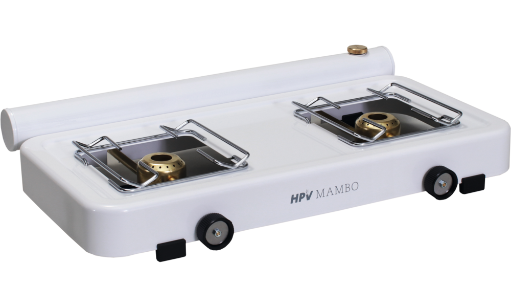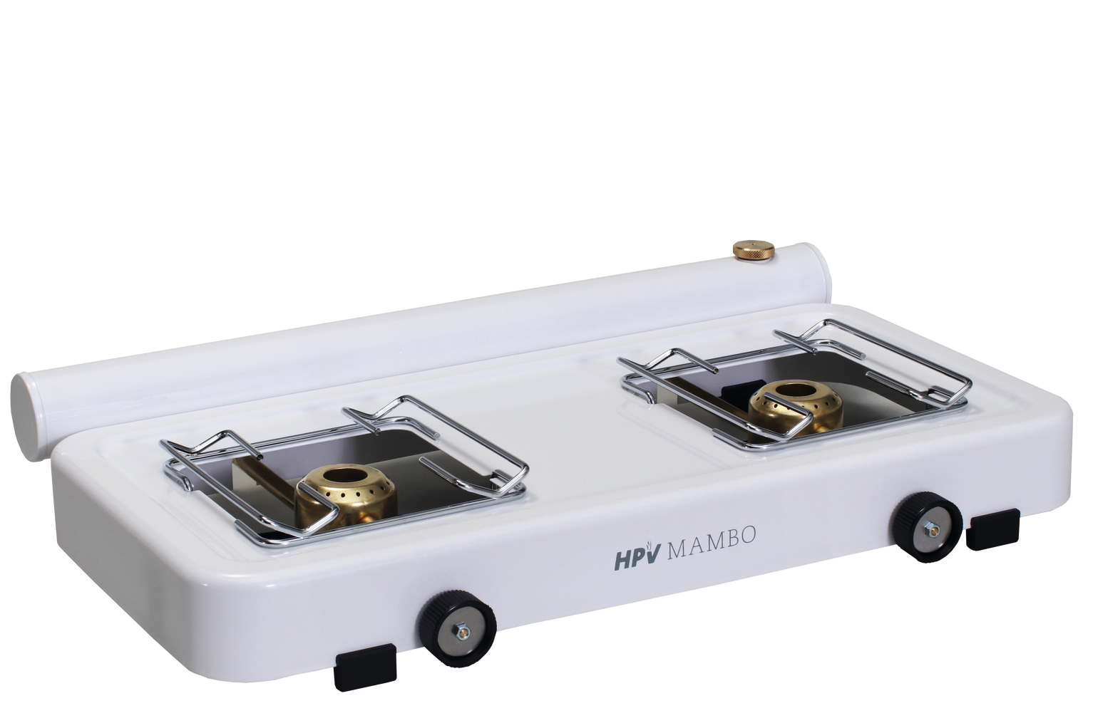 Spirituskocher MAMBO. Zweiflammig. Pulverbeschichtetes Gehäuse. Topfrost verchromt. Brenner regelbar. Leistung 2 x 1,0 kW. Tankinhalt 0,8 l. Brenndauer 2 x 2 h.
