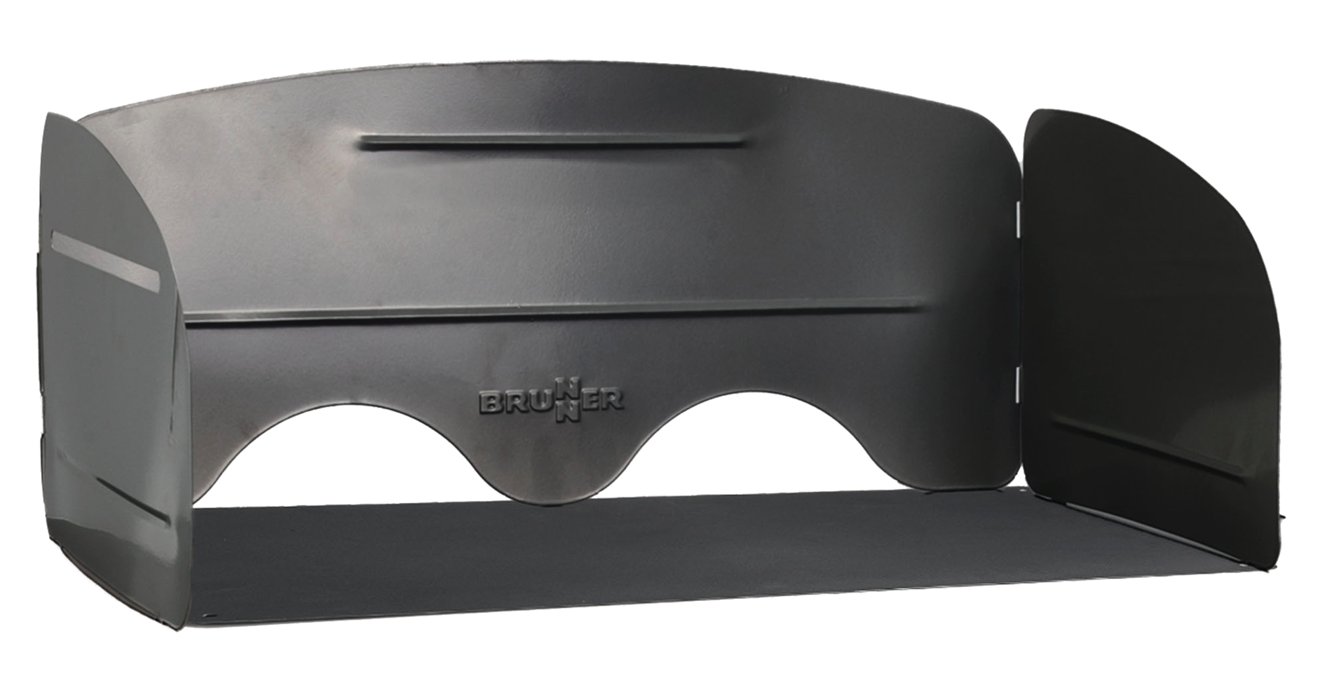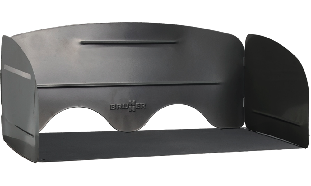 Kocher-Windschutz. Selbststehender Kocher-Windschutz aus pulverlackiertem Metall. An der Rückseite mit Einlassöffnungen für den Gas-Anschlussschlauch.