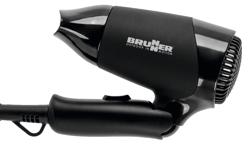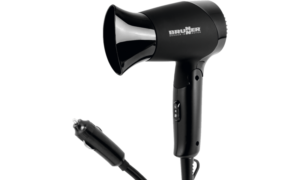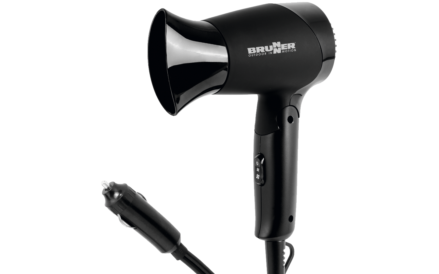 Reise-Haartrockner MONSUN. Nützlicher 12 V-Reise-Haartrockner. Modernes Design mit platzsparendem Klappgriff. Langlebiges Kunststoffgehäuse. Komplett mit EIN/AUS-Schalter, Zigarettenanzünderstecker, abnehmbarer Quetschdüse und praktischer Tragetasche.