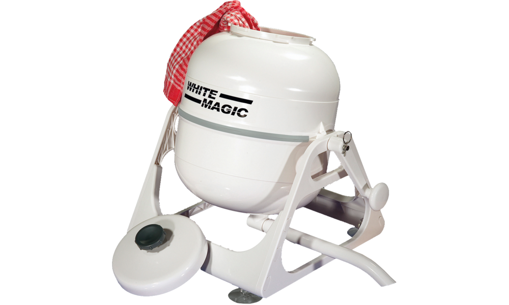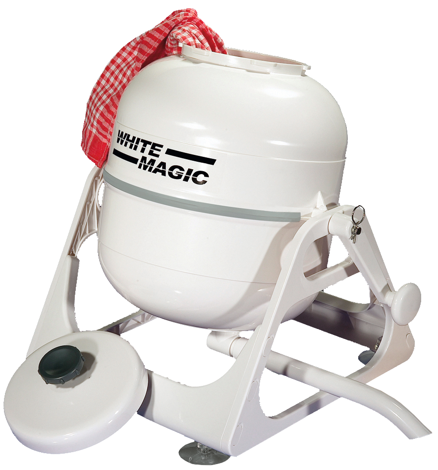 Waschmaschine WHITE MAGIC. Die ideale Lösung für Camping, Wohnmobil, Boot und die Wäsche zwischendurch. Die Waschmaschine WHITE MAGIC funktioniert ganz ohne Strom. Sie wird mit einer Kurbel betrieben und ist überall einsetzbar. In wenigen Minuten ist Ihre Wäsche wieder sauber und frisch. Durch das einzigartige Hochdrucksystem dringt das Waschpulver tief in die Fasern ein, wodurch die Kleidung nicht nur einfach und kostensparend, sondern auch gründlich und in sehr kurzer Zeit gereinigt wird. Die Maschine verbraucht dabei viel weniger Wasser als bei Handwäsche. Der Deckel ist mit einem Sicherheitsverschluss ausgestattet, sodass nichts herausfallen kann. Wäschefüllmenge bis 2,2 kg. Material Kunststoff.