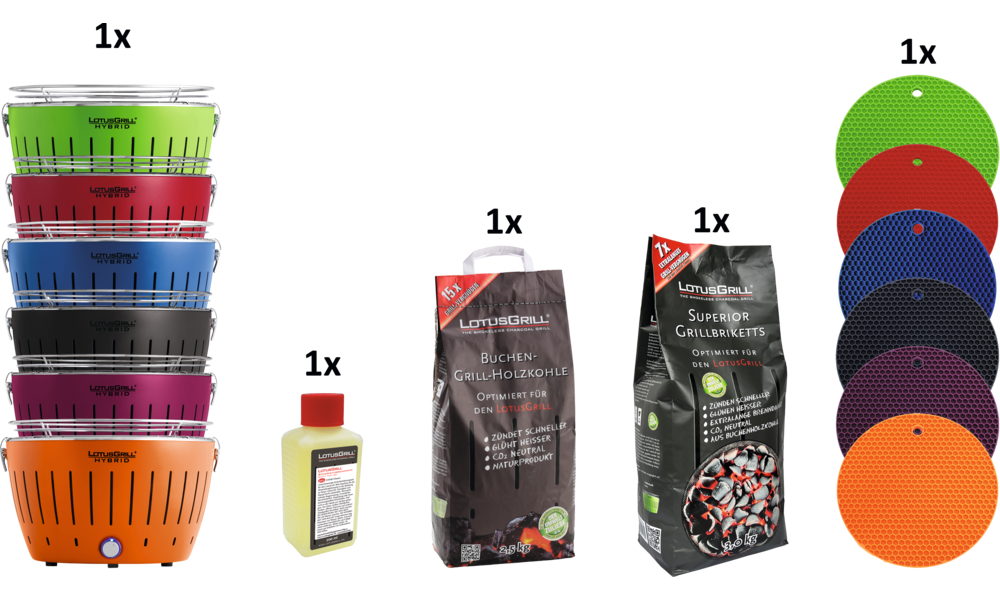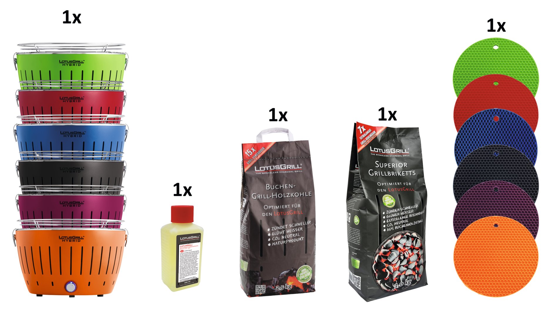Wählen Sie eine der 4 Grillgrößen für Ihr Grillset und erhalten zu jedem Grill eine Brennpaste, einen Sack Buchenholzkohle und einen Sack Grillbriketts gratis dazu.