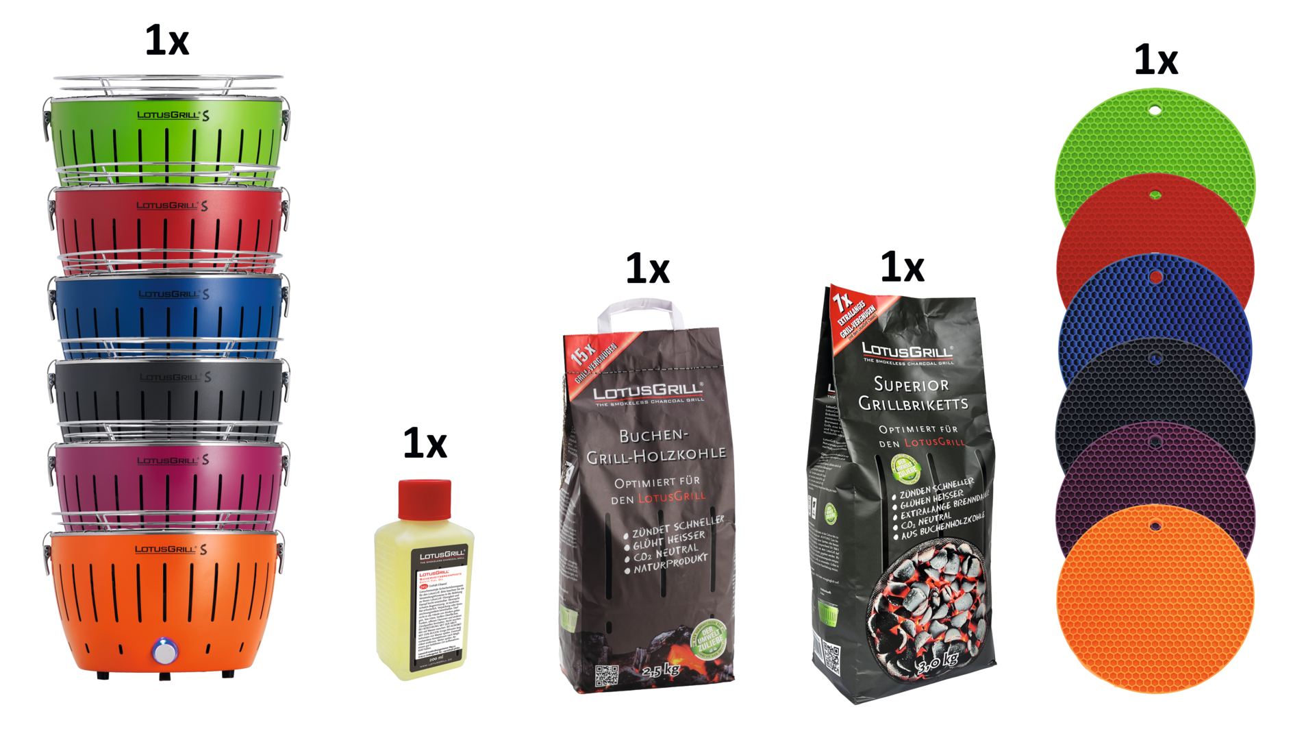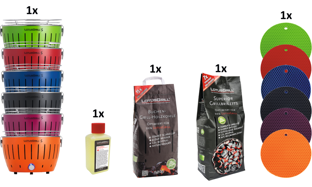 Wählen Sie eine der 4 Grillgrößen für Ihr Grillset und erhalten zu jedem Grill eine Brennpaste, einen Sack Buchenholzkohle und einen Sack Grillbriketts gratis dazu.