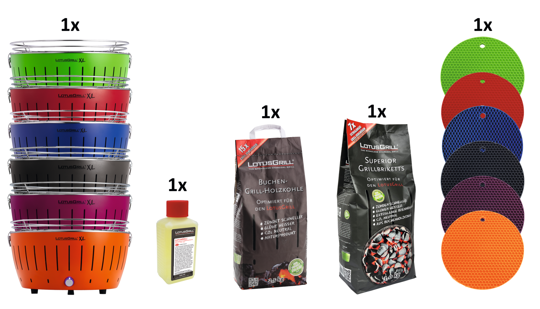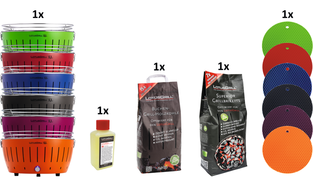 Wählen Sie eine der 4 Grillgrößen für Ihr Grillset und erhalten zu jedem Grill eine Brennpaste, einen Sack Buchenholzkohle und einen Sack Grillbriketts gratis dazu.