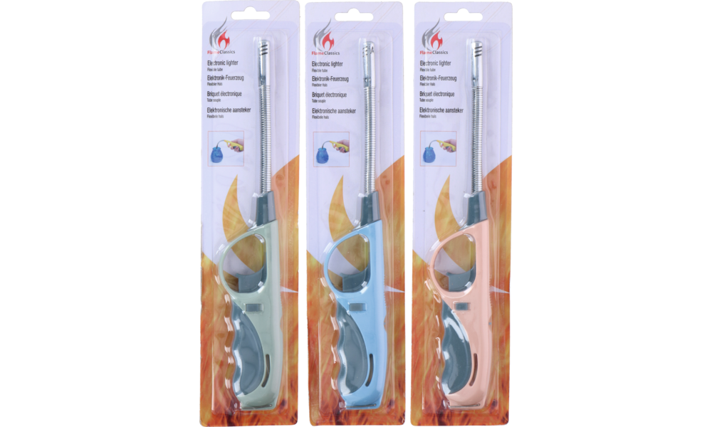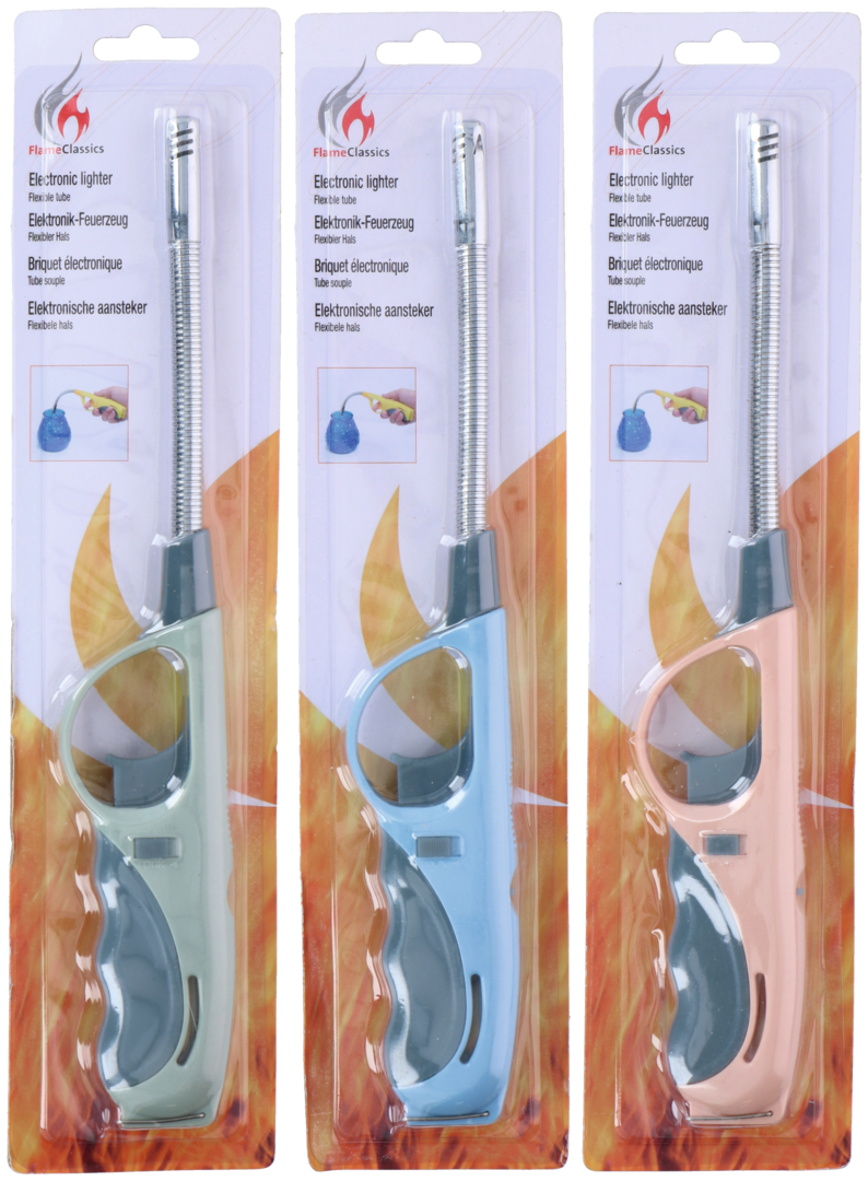 Stabfeuerzeug. Elektronisches Stabfeuerzeug mit Sicherheitssperre. Mit einstellbarer Flamme und nachfüllbar. Farblich sortiert.