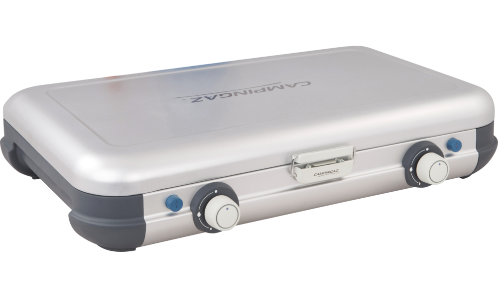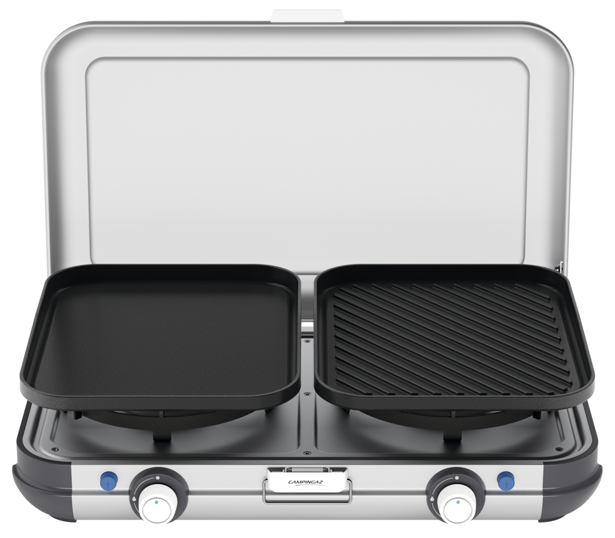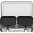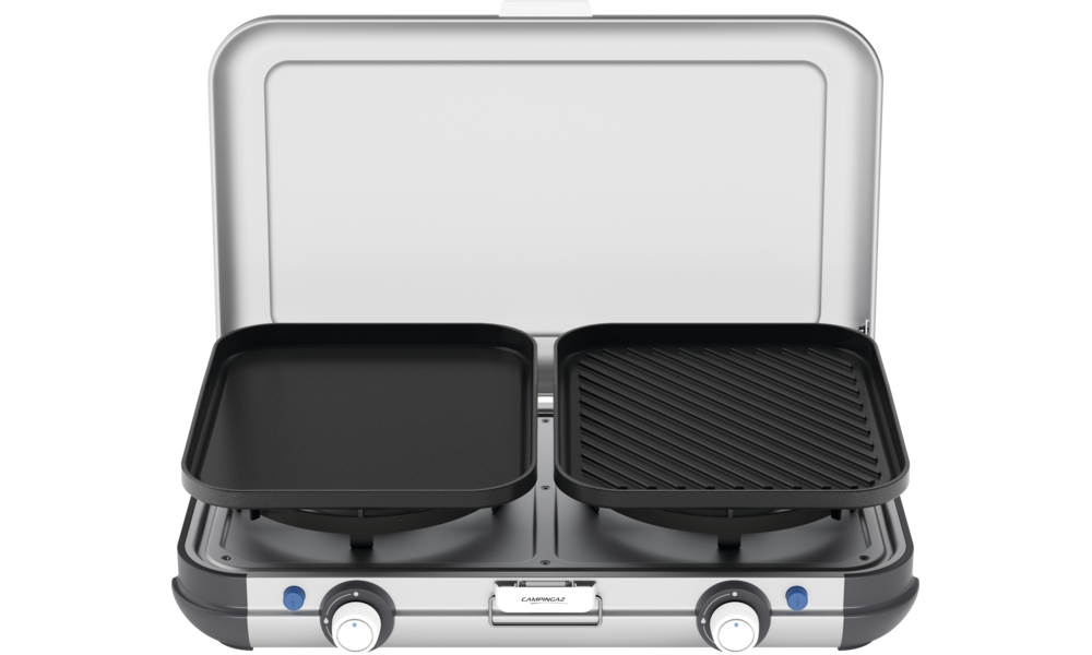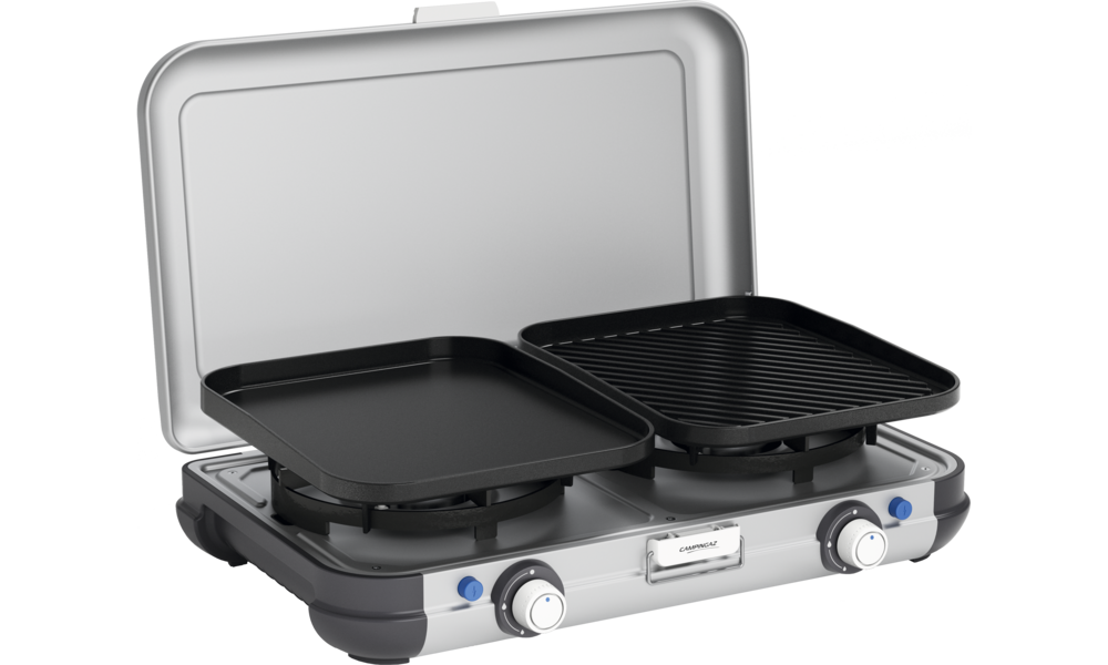 Plancha und Grillplatte aus emailliertem Stahl mit Antihaftbeschichtung. Beide Brenner mit Piezozündung.