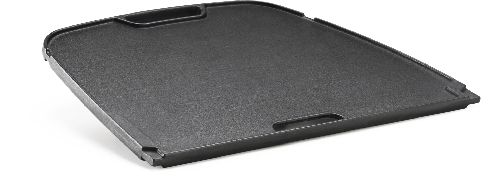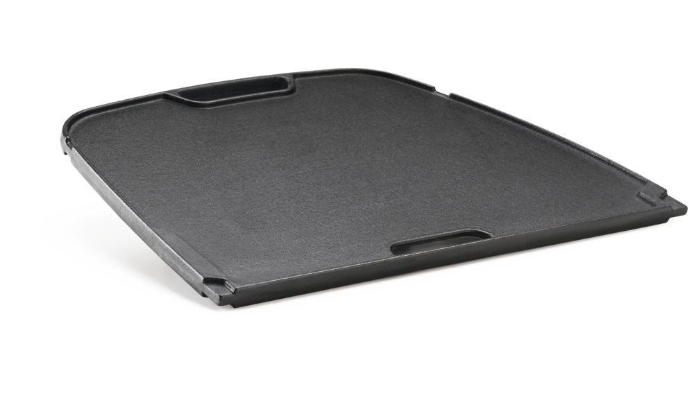Gussplatte TravelQ. Die Gusseisen-Grillplatte wurde speziell für die einzigartige Form des TravelQ™ entwickelt. Sie verfügt über einen praktischen Trage- und Aufbewahrungsgriff und ist mit kleinen Löchern versehen, sodass das Fett abfließen kann.