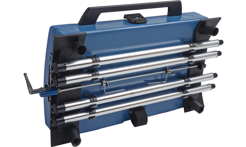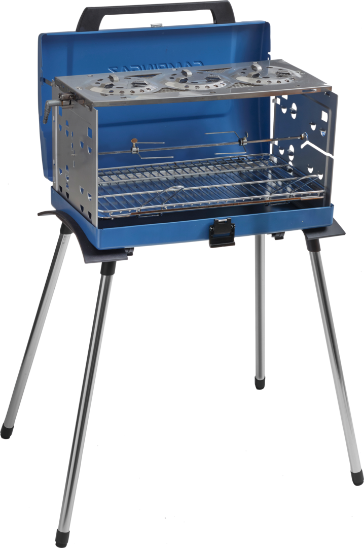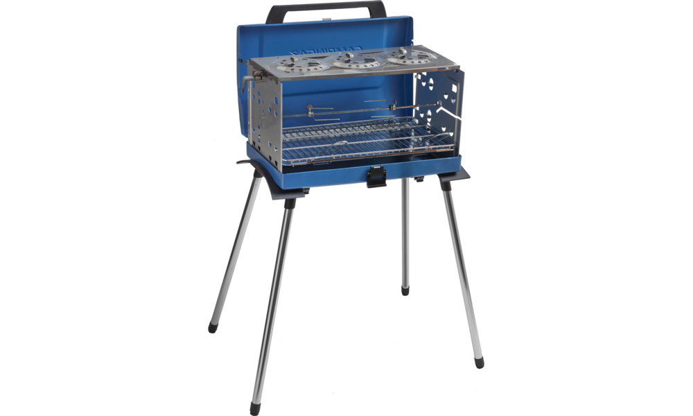 Die drei Flammen oben dienen als Herdplatten, während darunter ein Hähnchen am Spieß oder leckerer Fisch auf dem Grillrost gegrillt wird. Der Koffergasgrill ist ein kompaktes, vielseitig einsetzbares Kochgerät für jeden Urlaub, voll ausgestattet, mit praktischen Details und verpackt in ein modernes Design.