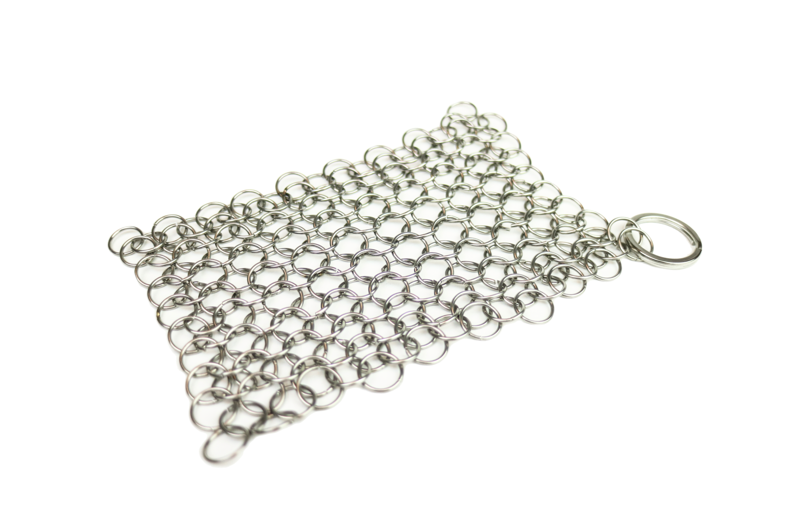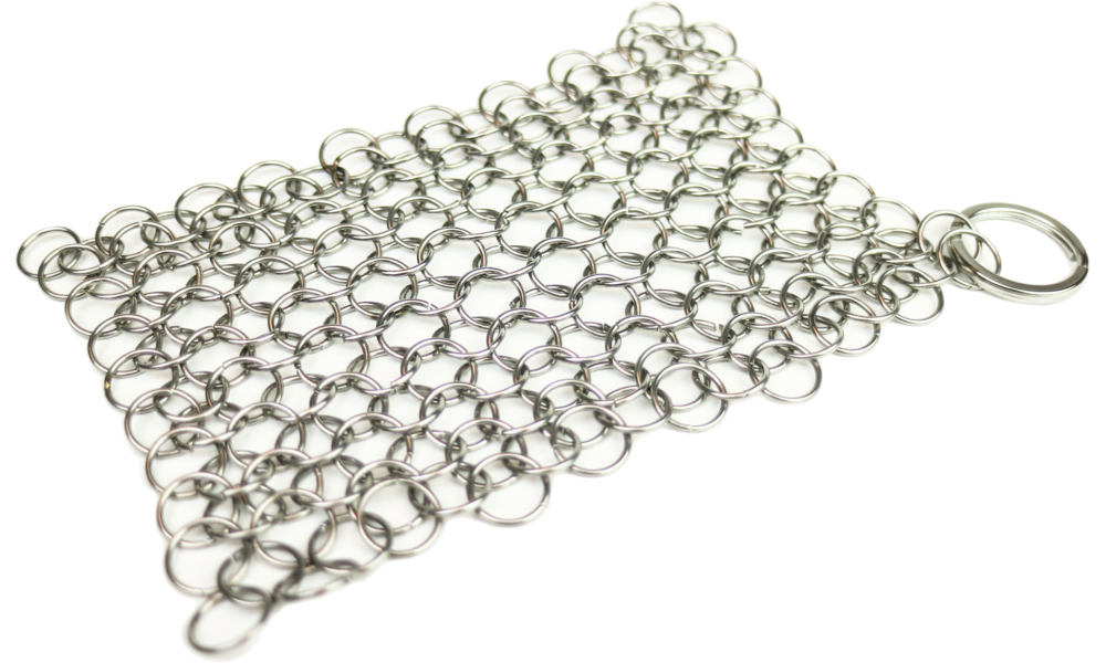 Valhal Ringreiniger. Dank der geflochtenen Edelstahlringe können Sie leicht eingebrannte Speisereste entfernen, ohne die Patina Ihrer Pfanne zu beschädigen oder Reinigungsmittel zu verwenden.