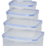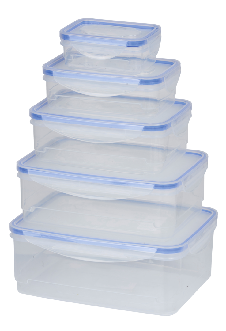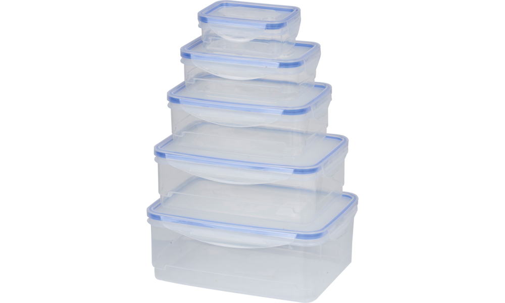 Mit Click-Verschlusssystem. Set bestehend aus 5 Dosen 0,17 l, 0,45 l, 0,85 l, 1,45 l und 2,3 l mit passenden Deckeln. Spülmaschinen- und gefriertruhengeeignet.