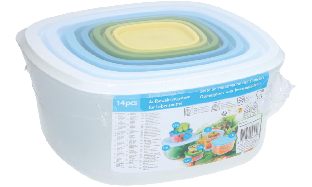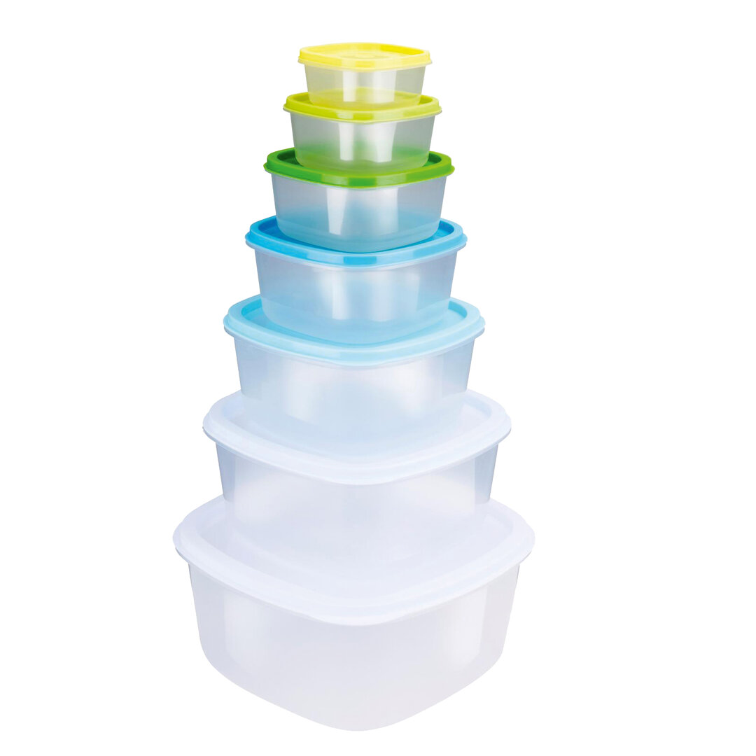 Aufbewahrungsdosen für Lebensmittel. Set bestend aus 7 Dosen 0,2 l, 0,35 l, 0,6 l, 1 l, 1,8 l, 5,6 l und 3 l mit passenden