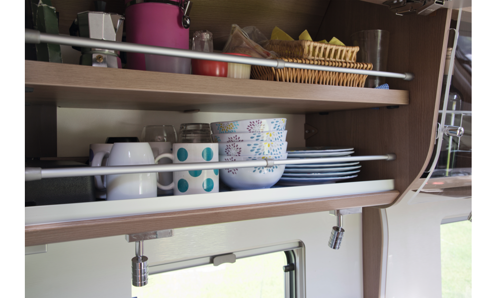 Die Stange wird gegen den Inhalt von Schränken geklemmt und verhindert das Verrutschen der Gegenstände während der Fahrt.