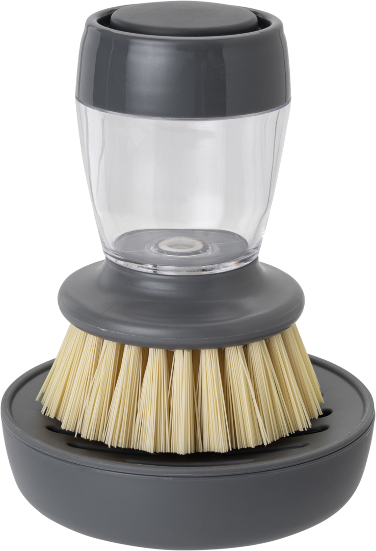 Der im Bürstenkörper integrierte Pumpknopf ermöglicht eine gezielte Dosierung des einzusetzenden Spülmittels. Inklusive Abstellschälchen.