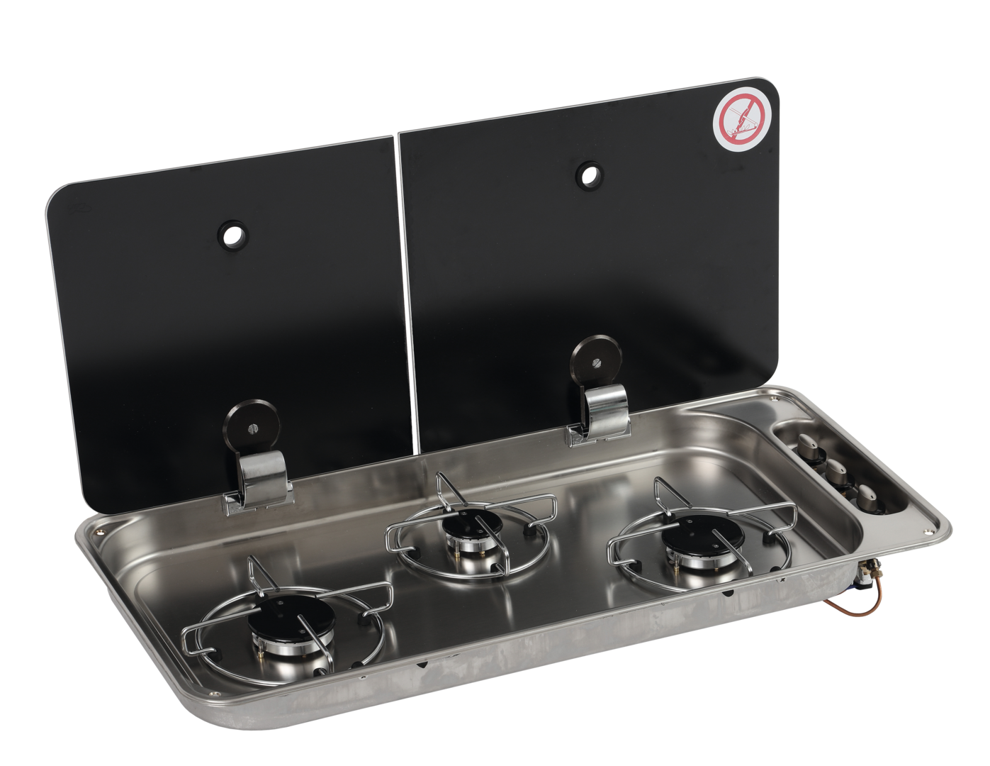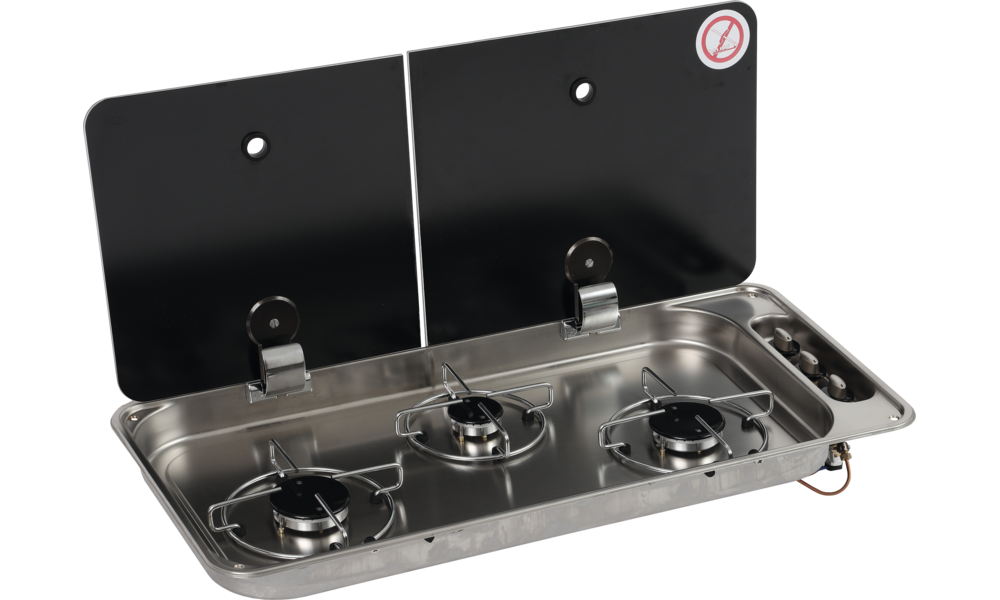 Kochmulde FC1349. 3-flammige Einbau-Kochmulde mit Abdeckung aus gehärtetem Sicherheitsglas. Mit elektronischer Zündung und Sicherheitszündsystem. Leistung 4,8 kW (1 x 1 kW, 2 x 1,9 kW). Gasverbrauch 327 g/h (1 x 73 g/h, 2 x 127 g/h). Gasanschluss 30 mbar.