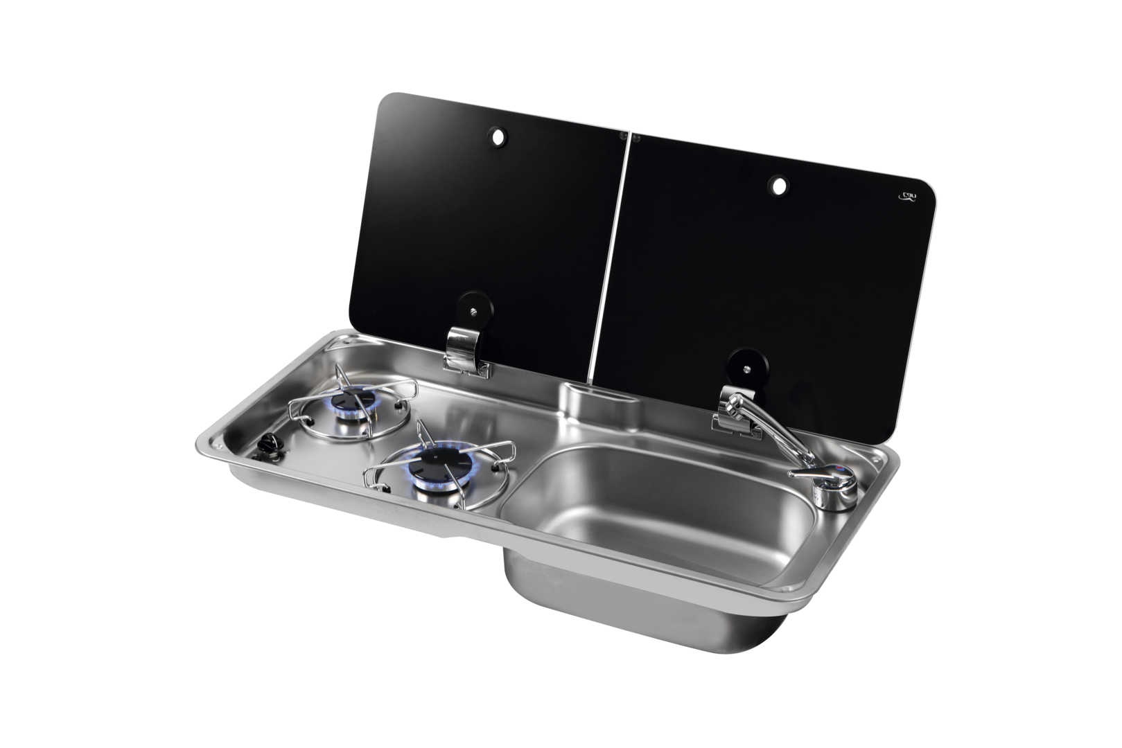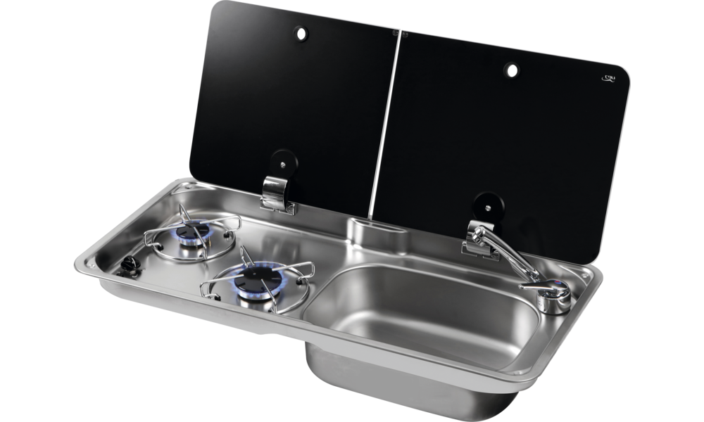 2-flammige Kocher-Spülenkombination mit rechteckigem Becken. Mit Piezo-Zündung. Leistung 2,9 kW (1 x