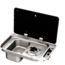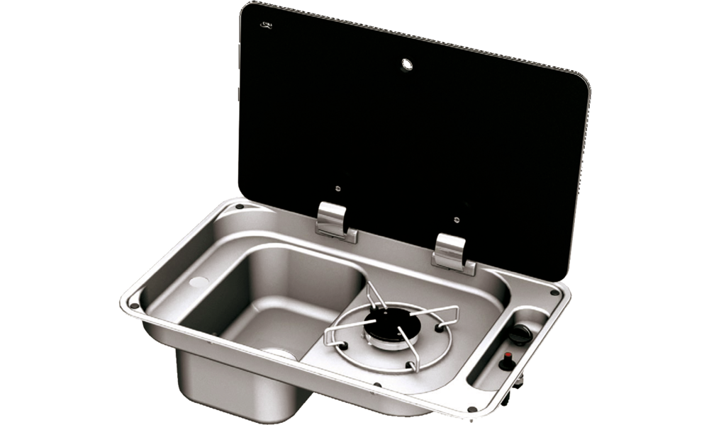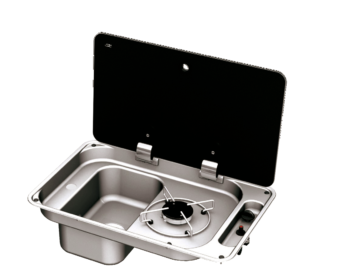 1-flammige Kocher-Spülenkombination mit rechteckigem Becken. Mit Piezo-Zündung. Leistung 1,9 kW. Gasverbrauch 127 g/h. Gasanschluss 30 mbar.