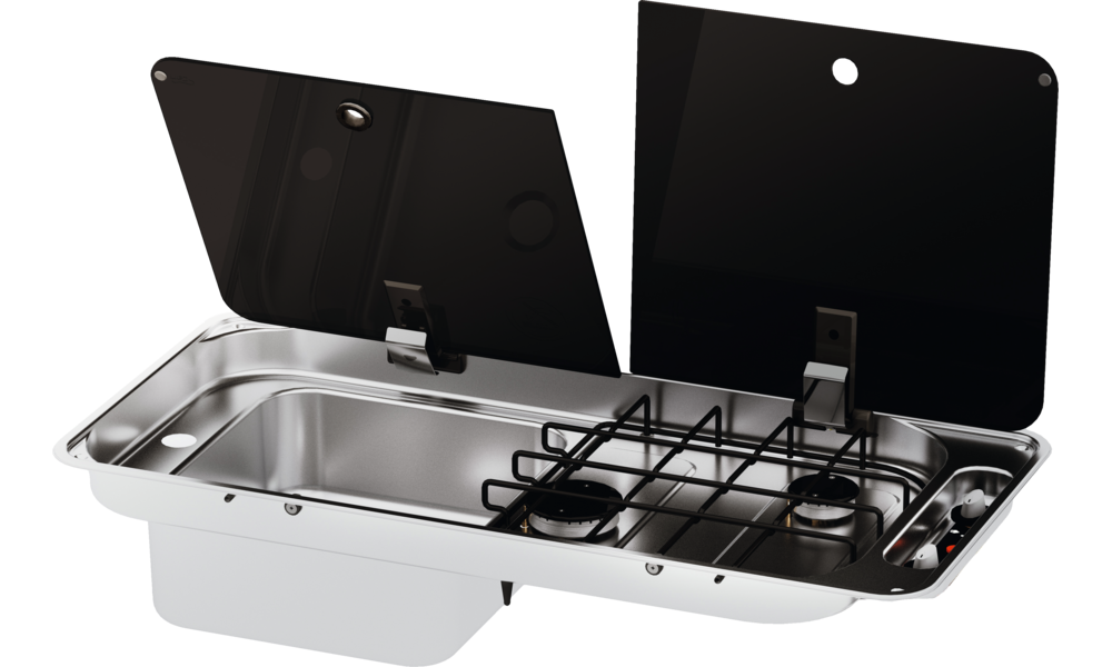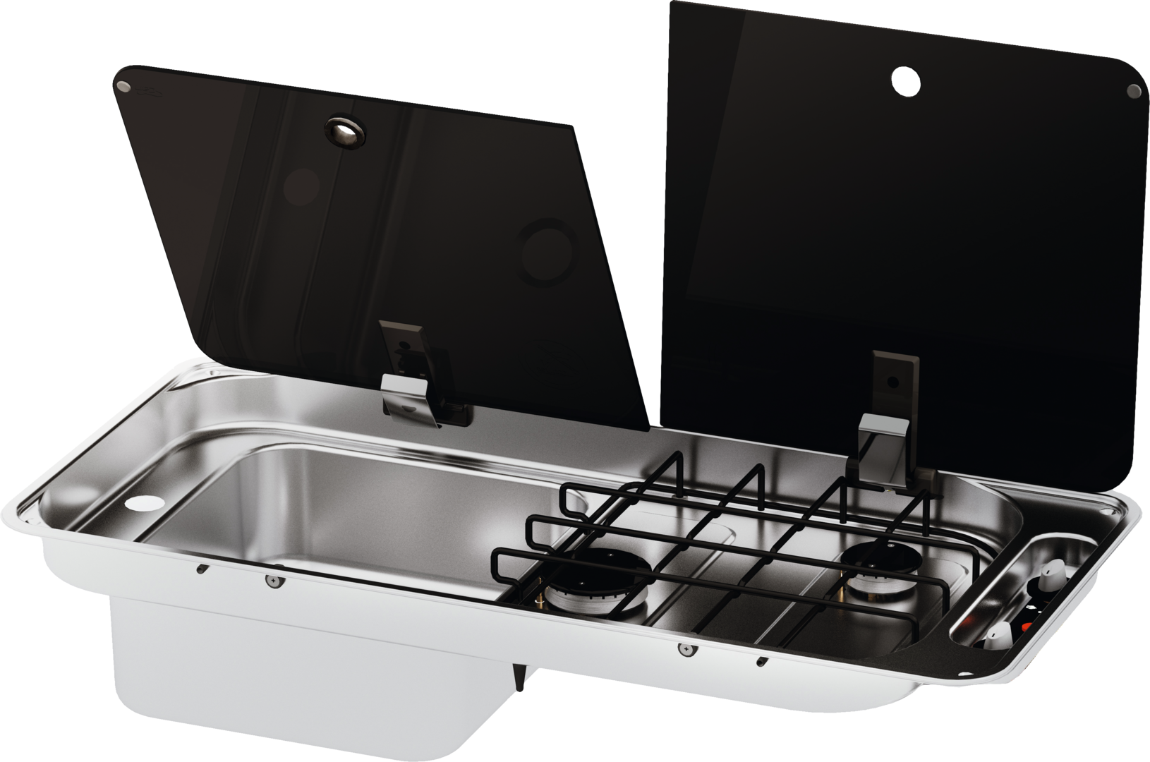 2-flammige Kocher-Spülenkombination mit rechteckigem Becken. Mit Piezozündung. Leistung 2,7 kW (1 x 1 kW, 1 x 1,7 kW). Gasverbrauch 200 g/h (1 x 73 g/h, 1 x 124 g/h). Gasanschluss 30 mbar. Abmessungen