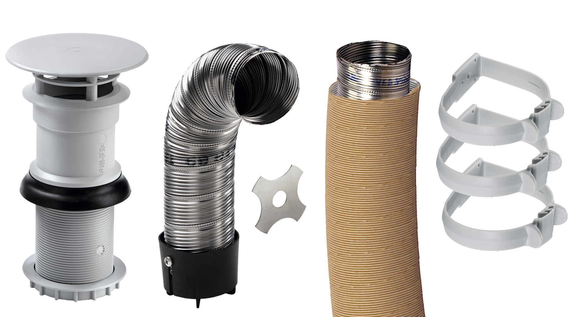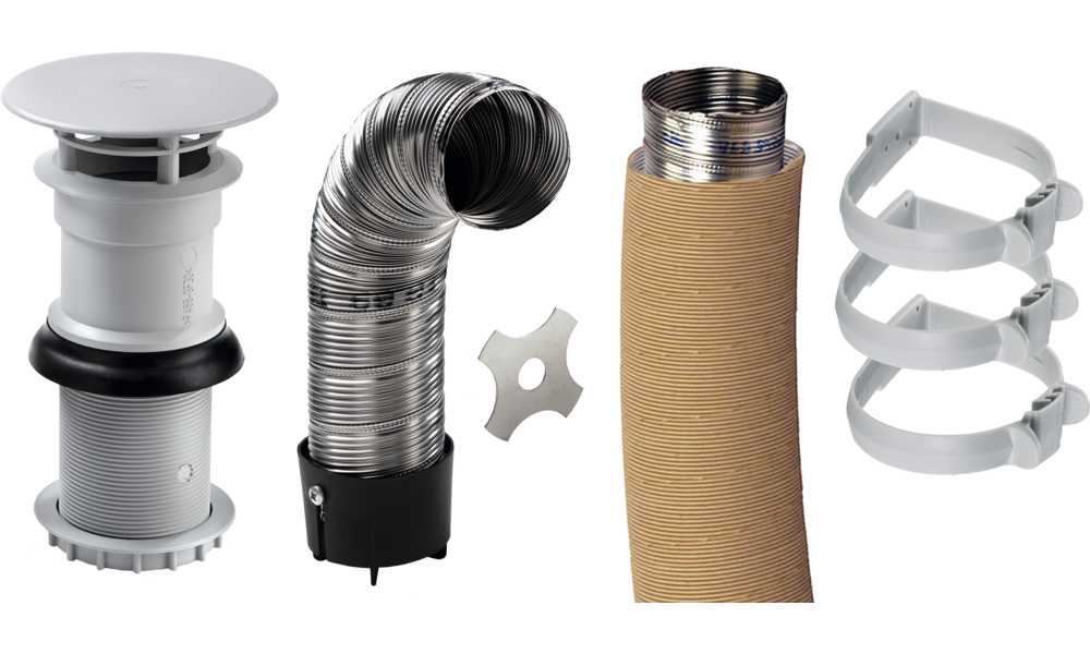 Bestehend aus Kamin, 2,5 m Abgasrohr, 2 m Überrohr, 3 Schellen und Ansaugstutzen.
