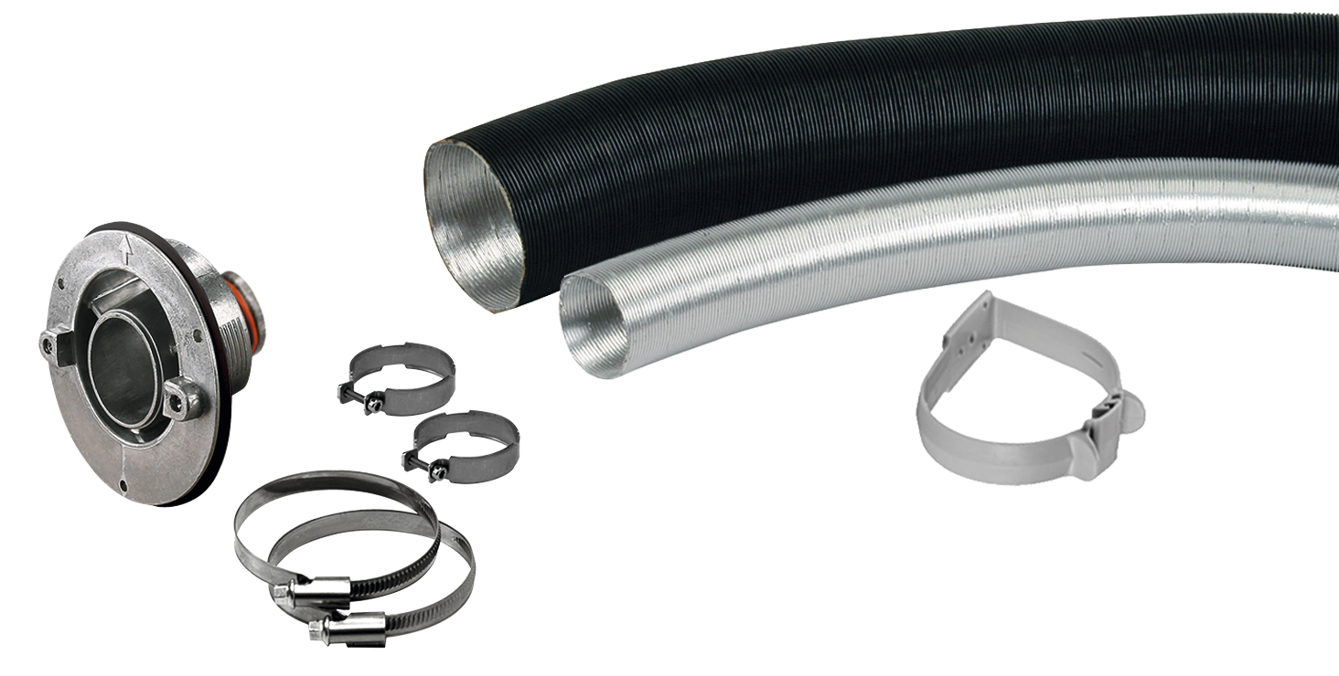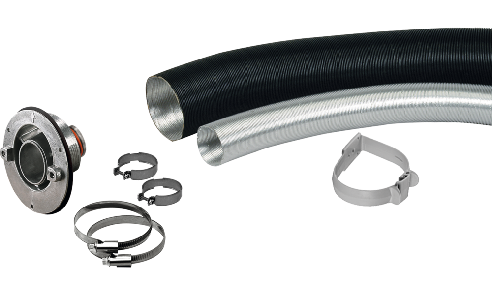 Wandkaminsets bestehen aus: Kamininnenteil, 1 m Abgasrohr, 1 m Zuführungsrohr und Schellen (ohne Kaminaußenteil).