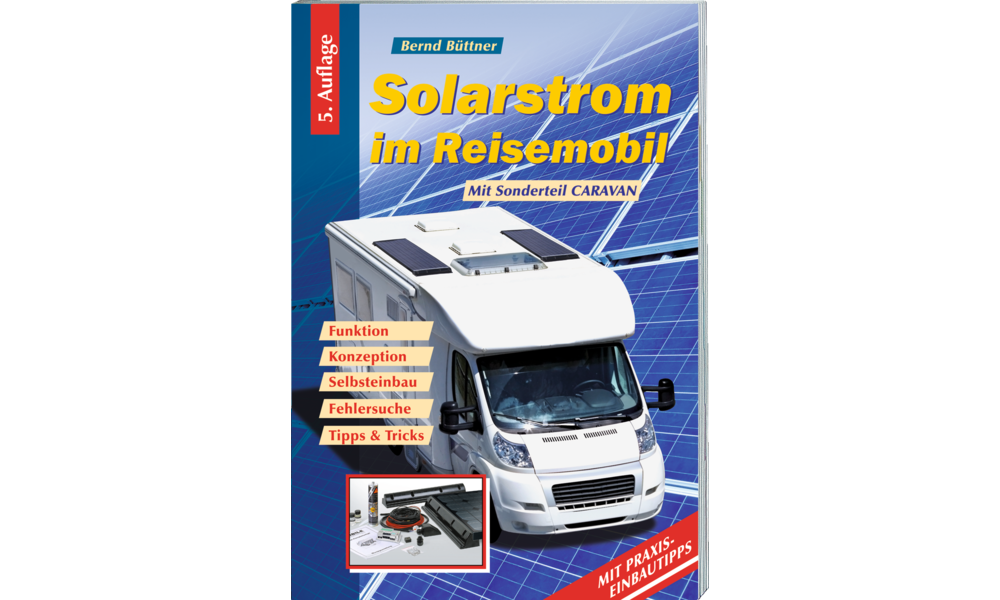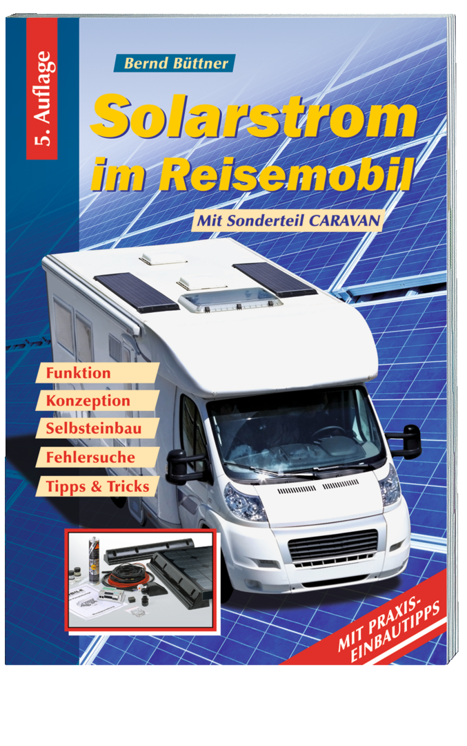 Solarstrom im Reisemobil. Das Praxisbuch für noch mehr Informationen. Das Standardwerk für alle, die sich mit dem Gedanken tragen, Solartechnik im Reisemobil oder Caravan einzusetzen. Der praktische Ratgeber beschreibt auf 120 Seiten leicht verständlich und mit vielen Bildern alles von der Konzeption bis zum Selbsteinbau der eigenen Solaranlage. Wer bereits eine Solaranlage hat, der findet viele Zubehörtipps sowie alles zur Fehlersuche.