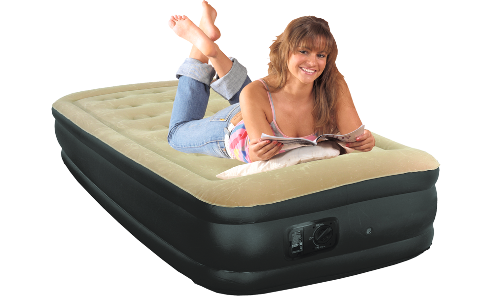 Gästebett Deluxe. Extra hohe Liegefläche, erhöhtes Kopfteil, beflockte Oberseite. Mit integrierter 230 V-Elektropumpe. Inklusive Tragetasche. Material 100 % Polyvinylchlorid.