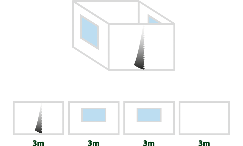 Größe 3x3. Bestehend aus einer Seitenwand mit Reißverschluss, zwei Seitenwänden mit Fenster und einer Seitenwand ohne Fenster.