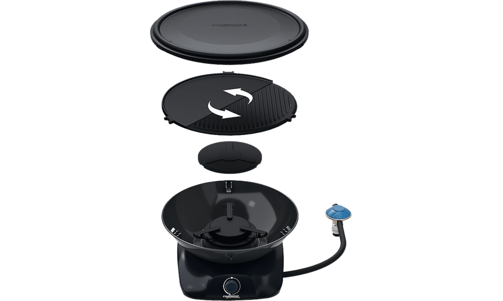 Gaskartuschen betriebener Tischgrill mit flachem Design, der ein 360 ° Grillerlebnis ganz bequem im Sitzen vom Tisch aus ermöglicht. Er bietet umfangreiche Grill- und Kochmöglichkeiten mit der integrierten, gerippten Grillplatte, einer flachen Kontaktgrillplatte sowie Topfträgern zum Kochen wie auf dem Herd. 360-Ring-Brenner mit hervorragender Flammenverteilung für gleichmäßige Hitzeverteilung über den gesamten Grill.