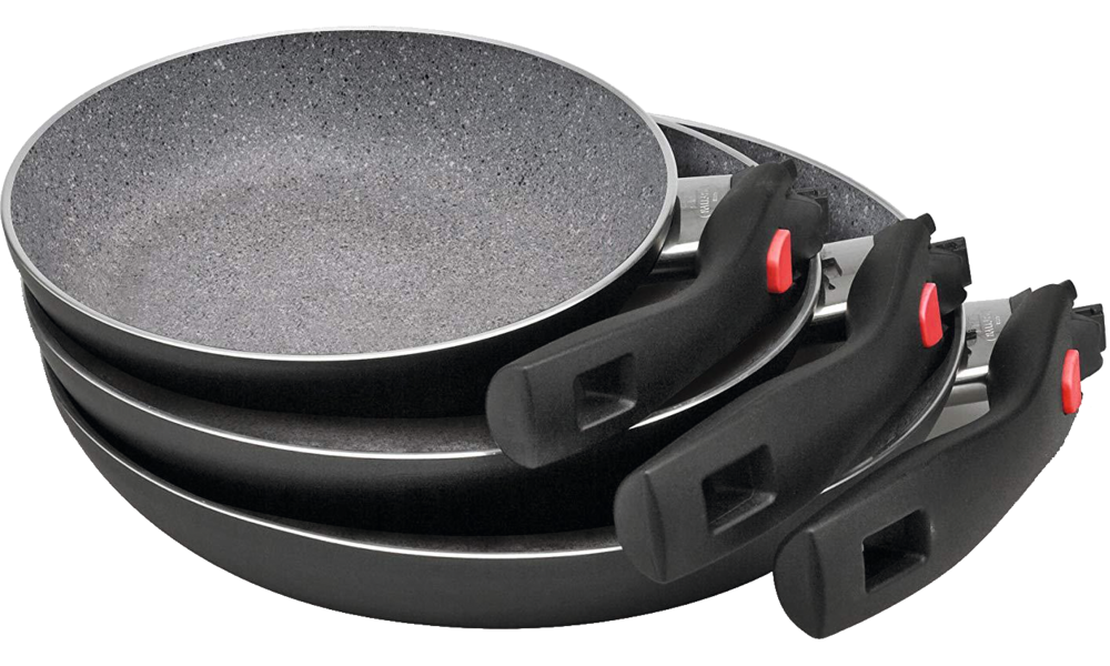 Eine revolutionäre Lösung, die Platz in der Küche spart! Abklappbare Griffe, ineinander stapelbares Kochgeschirr. Die neue Produktlinie Click & Cook von Ballarini ist vielseitig einsetzbar und platzsparend. Die Kunststoffgriffe können mit einer einfachen Bewegung eingeklappt und ausgeklappt werden. So haben Sie immer einen Platz im Küchen-schrank, Kühlschrank oder in der Geschirrspülmaschine. Da die Töpfe stapelbar sind, benötigen Sie also nur einen Stauraum von 12 cm in der Höhe. Die patentierte Arretie-rungsvorrichtung der Griffe erlaubt sicherste Handhabung während des Kochens. Beschichtung innen: 3-fach keramisch verstärkte Antihaftversiegelung KERAVIS. Beschich-tung außen: Pulverbeschichtet.