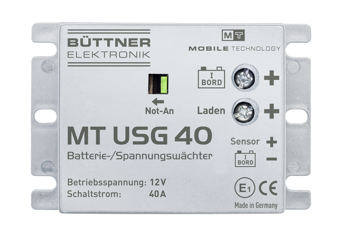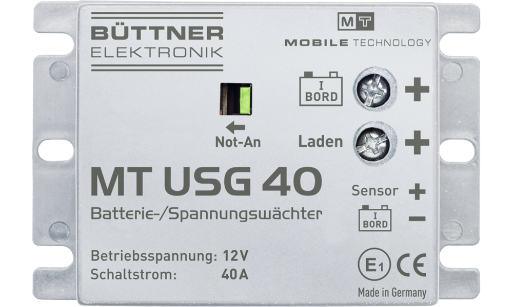 Der MT USG 40 wird zwischen Batterie und die 12 V-Verbraucher geschaltet. Er schützt Batterie sowie Verbraucher vor schädlicher Unterspannung (Verbraucher AUS bei 10,7 V) und die angeschlossenen Verbraucher vor schädlicher Überspannung (AUS bei 15,5 V). Über einen Schaltausgang ist der MT USG 40 fernbedienbar und somit auch als Hauptschalter (alle Verbraucher AUS/EIN) zu verwenden.
