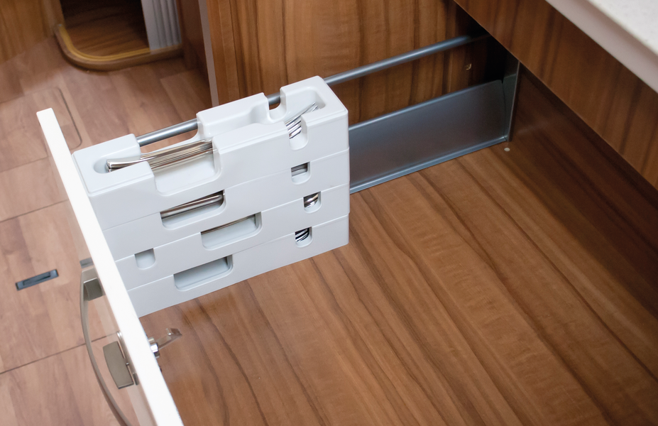 Stapelbare Besteckeinsätze, konturgenaue Führung des Bestecks und somit geräuscharm bei der Fahrt, modulare Verwendung, formstabil.