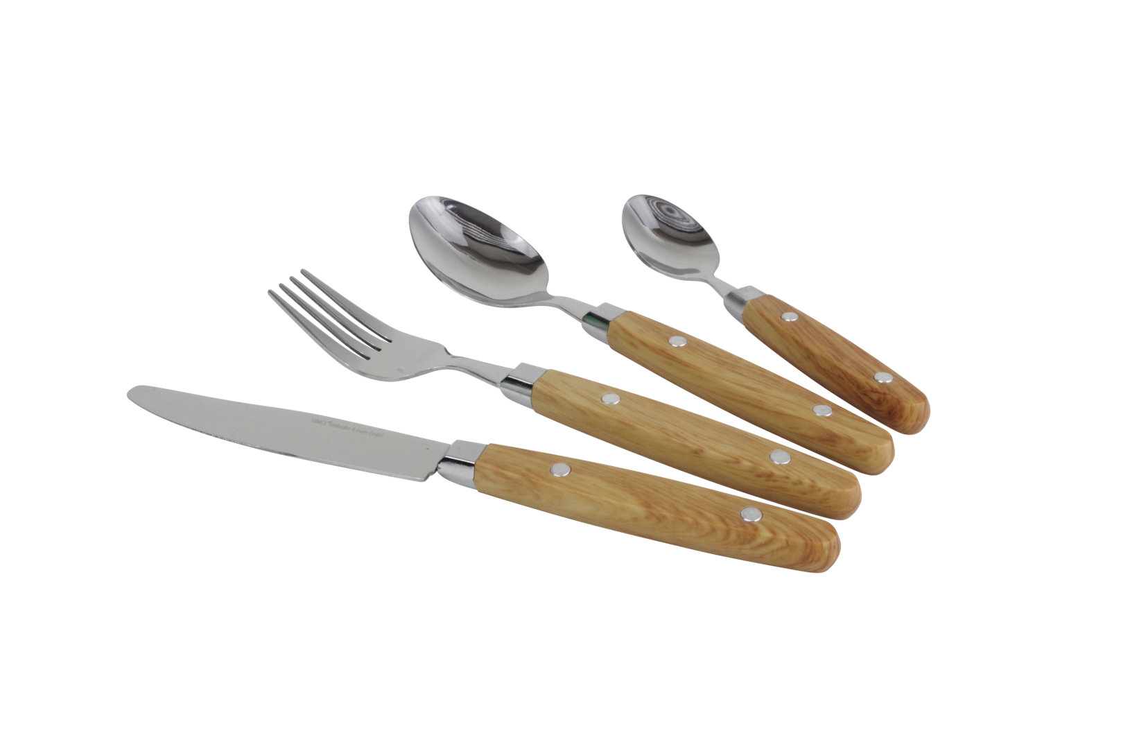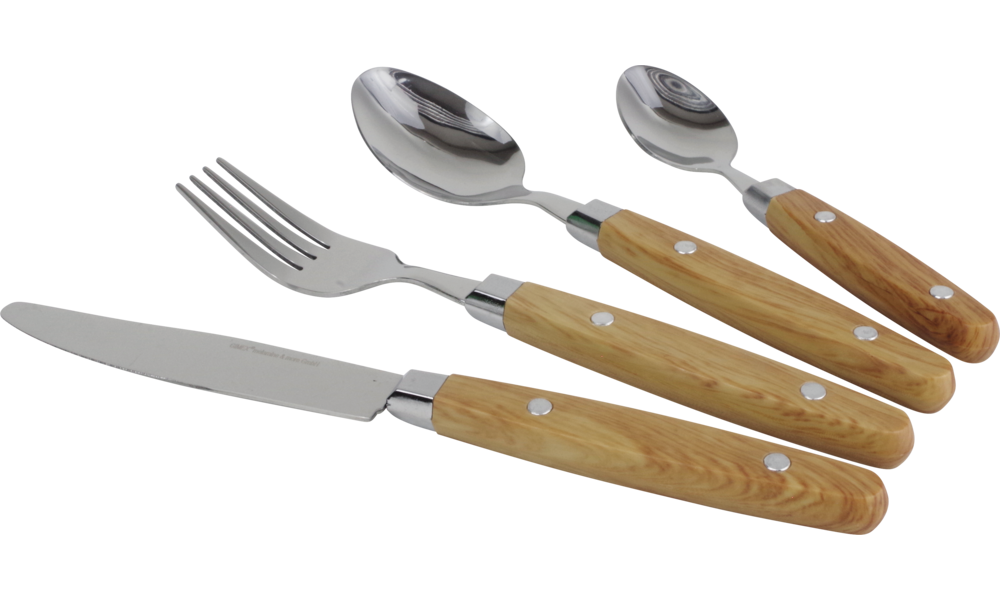 Besteckset NATURE LINE WOOD. 16-teiliges Besteckset (4 x Messer, 4 x Gabel, 4 x Löffel, 4 x Teelöffel) aus rostfreiem 18/0 Edelstahl mit Soft-Griffen aus hochwertigem Kunststoff. Spülmaschinengeeignet.