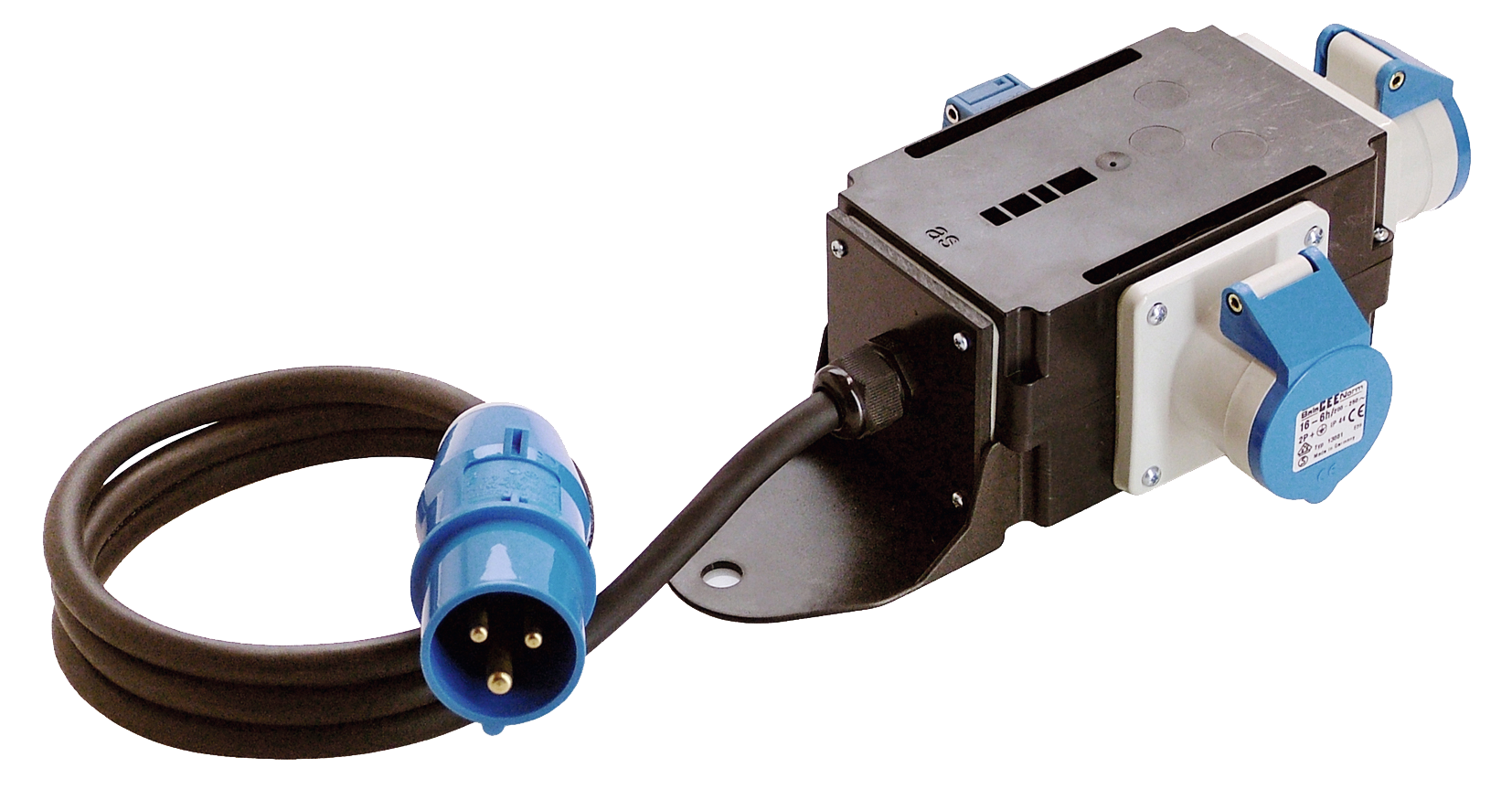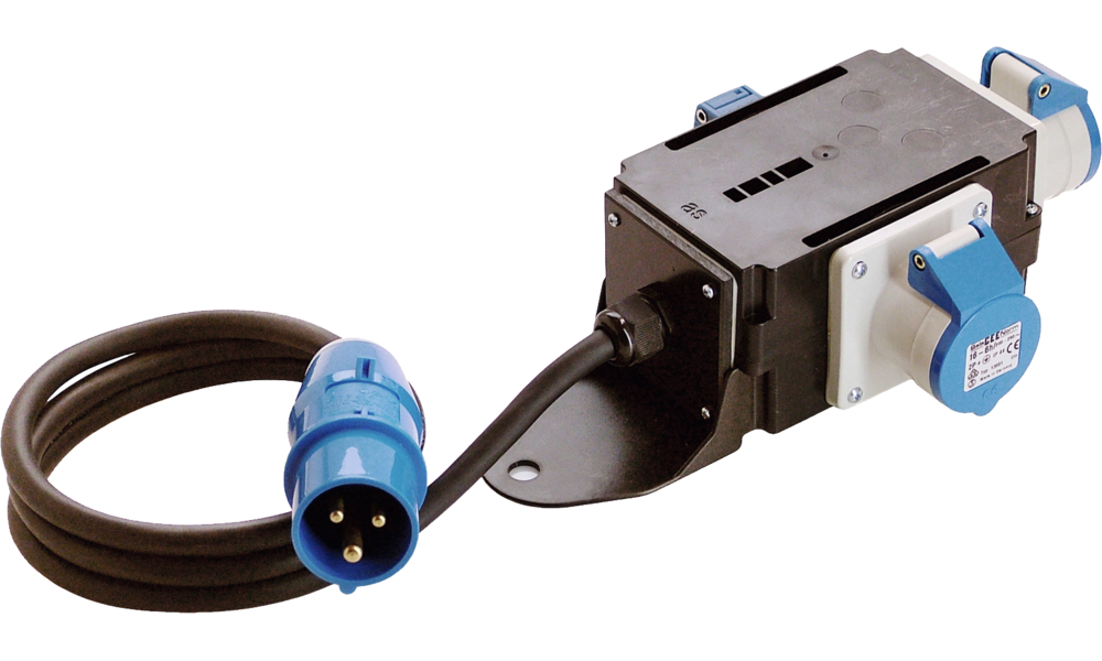 Eingang: 1 CEE-Stecker 230 V/16 A, 3-polig mit 1,5 m Zuleitung H07RN-F 3G2,5. Ausgang: 2 CEE-Steckdosen (230 V, 16 A, 3-polig) und 1 Schutzkontakt-Steckdose.