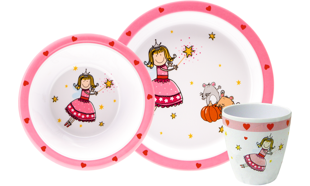 Kindergeschirrsets. Robuste und lebensmittelechte Kindergeschirrsets aus Melamin. Mit lustigen, farbenfrohen Designs. 3-teilig, bestehend aus Essteller, Dessertteller und Trinkbecher. Geschirr ist bruchunempfindlich und spülmaschinengeeignet. Nicht mikrowellengeeignet. TÜV geprüft. Nur solange Vorrat reicht!