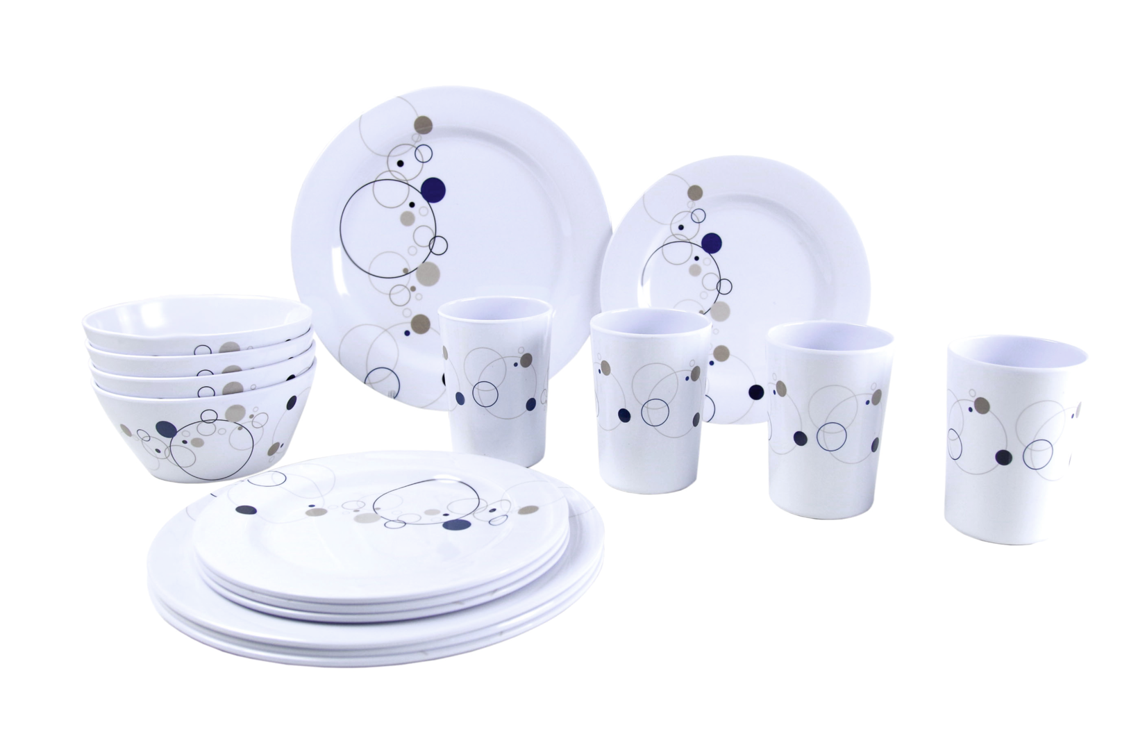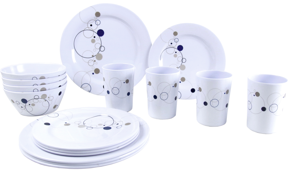 Geschirrset DROPS NAVY BLUE. 16-teiliges Geschirrset bestehend aus 4 Desserttellern, 4 Esstellern, 4 Bechern und 4 Müslischalen.