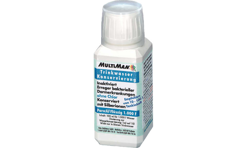 Konserviert Trinkwasser und schützt es in gereinigtem Tank und Leitungen bis 6 Monate vor Wiederverkeimung. Silberionen inaktivieren Erreger bakterieller Darmerkrankungen ohne Chlor und geben bis 6 Monate Schutz vor Wiederverkeimung.