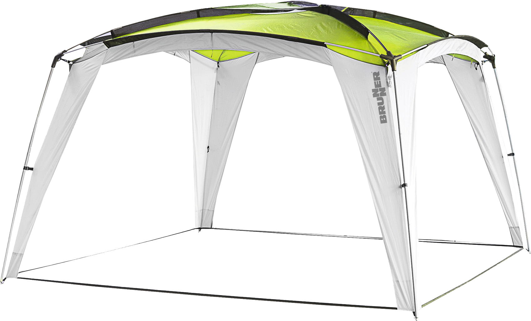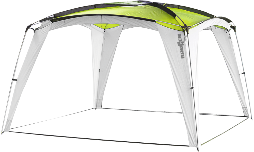 Hochwertiger Outdoor-Pavillon mit außenliegendem Stahl- und Fiberglasgestänge.