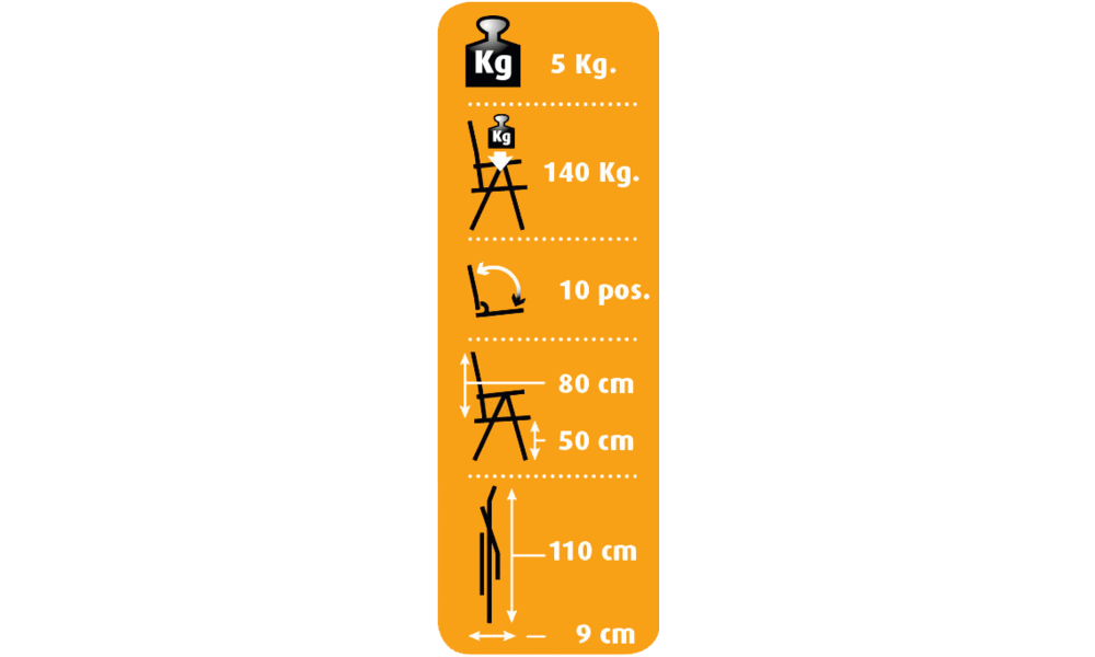 Armlehnen extra breit und aus glasfaserverstärk-tem Nylon. Bezug 100 % PES Polyester. Sitzfläche 48 x 44 cm, Sitzhöhe 50 cm, Rückenlehnenhöhe 80 cm. Belastbarkeit 140 kg.
