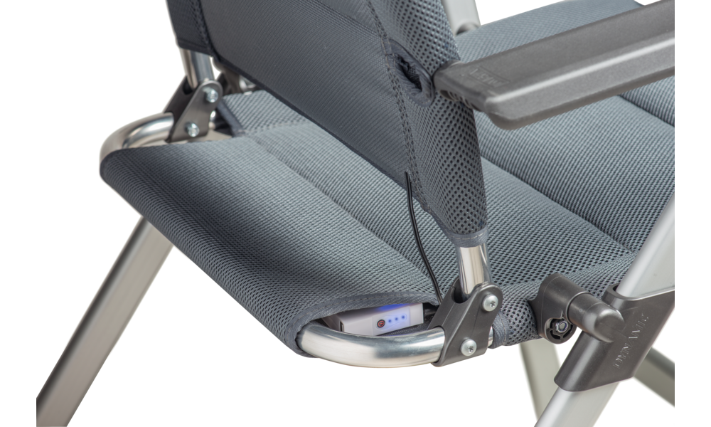 Er verfügt über einen Sitz und eine Rückenlehne mit eingearbeiteter Heizfo-lie. Die Heizung wird durch einen Akku gesteuert, jeweils einer für den Rücken und einer für den Sitz. Zwei Akkus (2.600 mA / 4.400 mA) und ein 230 V-Ladegerät (Eingang 100-240 V/0,5 A, Ausgang DC 8,7 V/1 A) sind im Lieferumfang enthalten. Gepolsterter Sessel mit einem ultra starken, witterungsbeständigen 3D Mesh Gewebe.