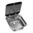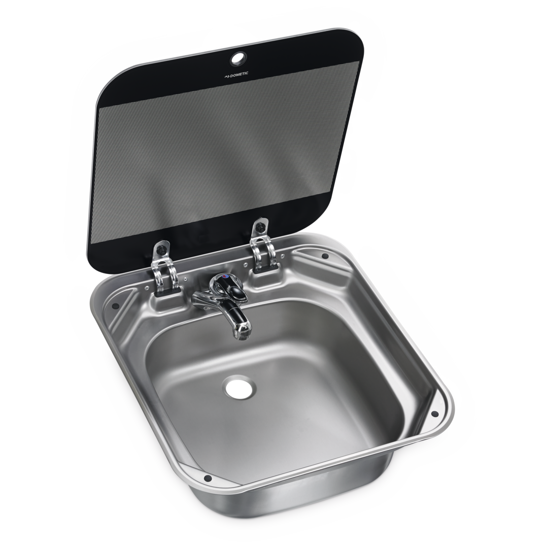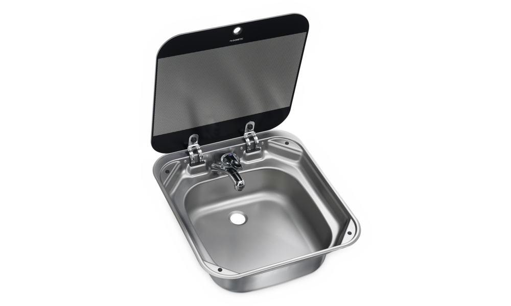 Dometic SNG 4244. Spülbecken eckig mit Abdeckung aus temperaturbeständigem Sicherheitsglas, Siphon, Gummidichtung, mit Bohrung für Wasserhahn (ø 39 mm).