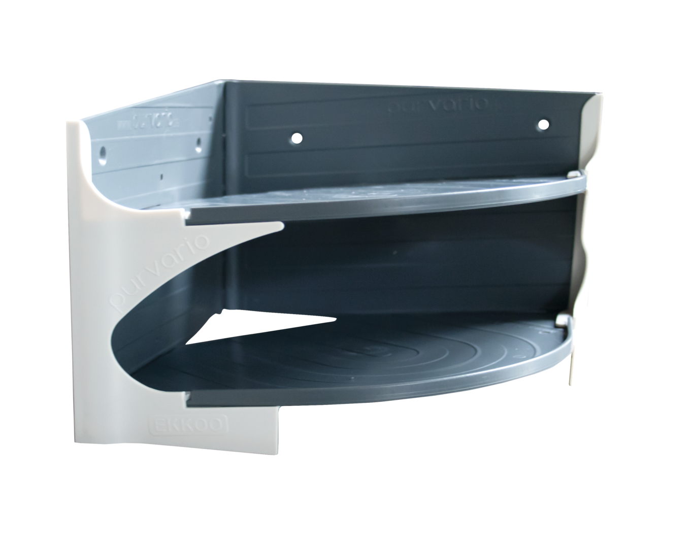 Optimale Sicherung durch schräg nach hinten abfallende Einschubfächer. Passende Formführung der Teller an zwei Seiten, Rillenerhöhung und Außenkante an den zwei Fächern erhöht die Standsicherheit. Bohrlöcher vorhanden.